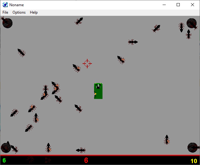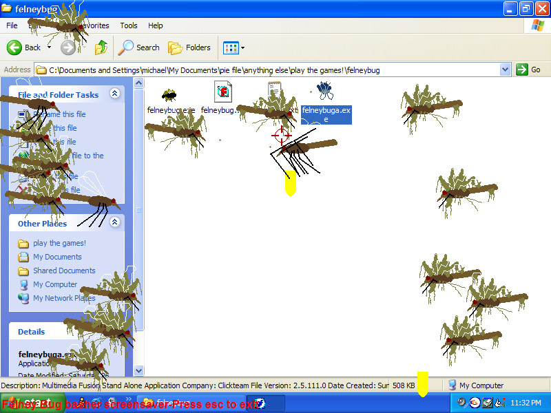 This uses your current screen as it's background, but runs at 800X600, so it looks wierd at higher resolutions. Anyway bugs come flying onto the screen, so blast them until the screen is covered in splatted bits. |