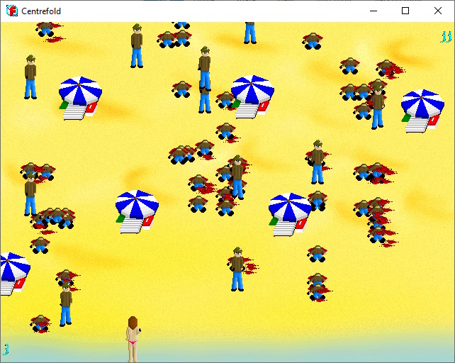 Part of a mooted "101 Offensive Games Pack", of which I made two. I've never played Centipede, so I largely guessed what it might be like from screenshots and created this overly-easy game! (at least there's gore in it). You play as a supermodel who was topless sunbathing, and have to blow away hordes of tabloid photographers. Orignally there was going to be an ending screen with increasing nudity of the main character, depending on your score. But I didn't finish all the pictures. The ones I did finish are included in the zip... but not the ones you want to see! |