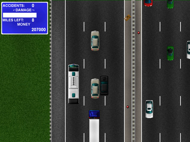 Speed down the motorway, ramming other cars off the road in an attempt to bankrupt the insurance companies. But don't hit buses or trucks because they're too big to tangle with. Features absolutely terrible collision detection and "physics". |