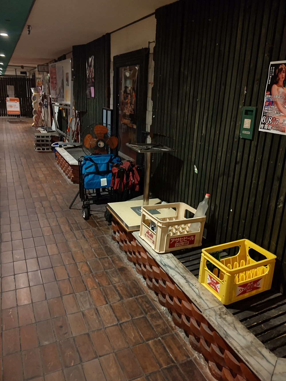 First Floor - Before Bar Fun-11. This place was many things over the years. Before the ramp was added, it was a long hallway where patrons would buy their tickets, then take a rear, internal, staircase up to the cabaret. Presumably emerging somewhere off to the sides of the stage. Once the building was remodelled, this was a (presumably quite small and narrow!) supermarket for many years, before it was closed down. Before there was Bar Fun-11, and at the time the book was written in 2011, Bar Fun-11 was something called Galaxy Gallery. This appears to have been a museum of sorts, with nostalgic old flyers and posters about the Misono, and also some merch! Looking at somebody's Google Maps picture from July 2016 (when I was in Osaka, and could have gone... if only I'd known!), this appears to have closed down, and they were advertising for "tenanto" to fill the space. Pictures in the book suggest Bar Fun-11 was quite the remodel, as the space used to be occupied by a number of small "kiosks". It also looks like it was a lot longer! It ran parallel to the entrance tunnel to the car park. The bar seemed shorter than that, so perhaps when it was Galaxy Gallery, it ran all the way down. Also, a look into how one of the bars used to be in 2011! But I don't know which one it is. Possibly this bar was downstairs in the Galaxy Gallery! In 2009, the earliest Google Maps images, you can just about make out a "vending machine corner" in this general area. It also had a passage "through" to the tunnel leading to the car park. |