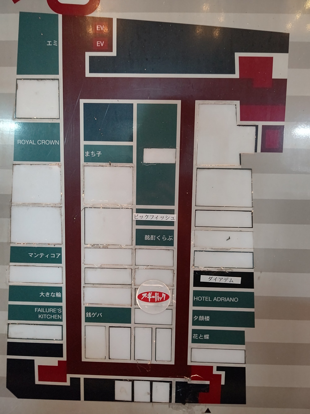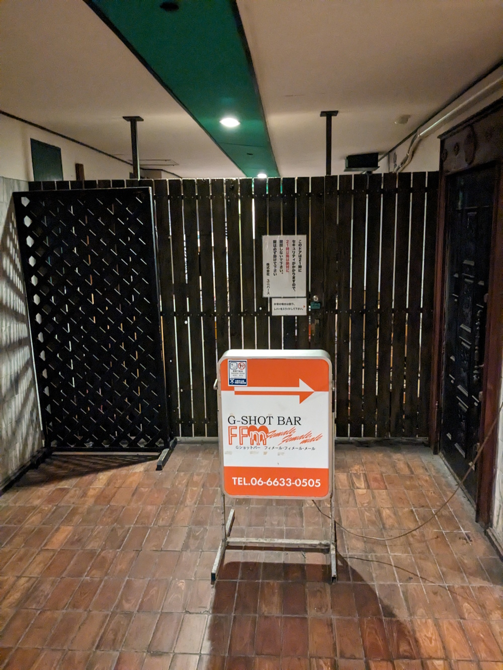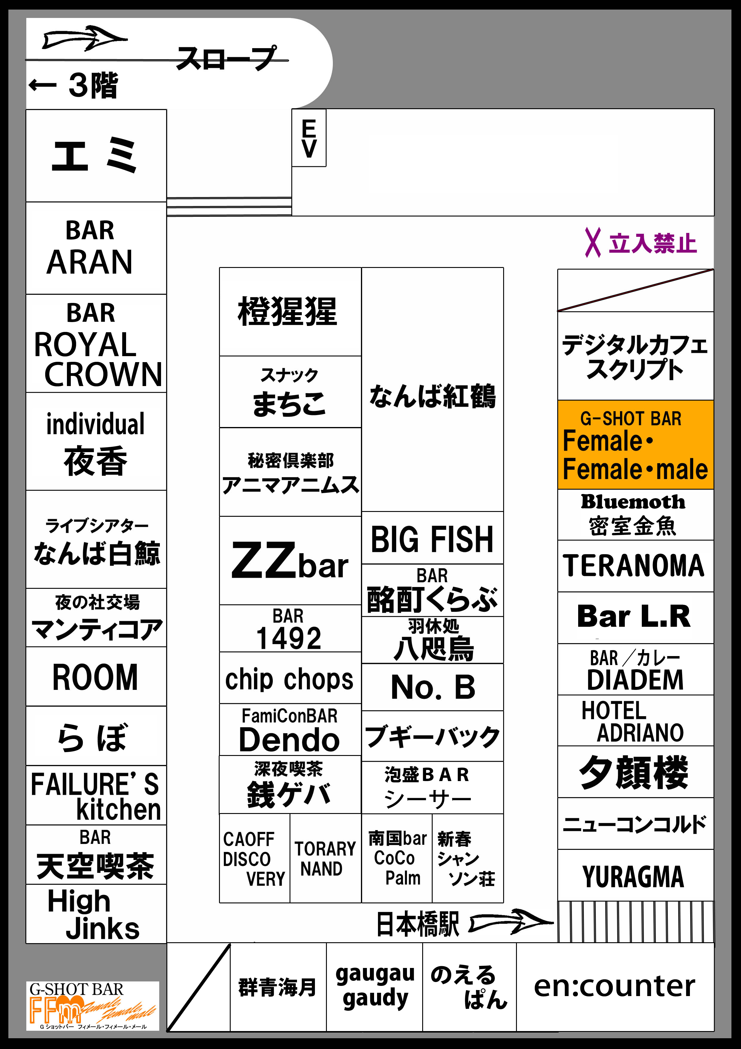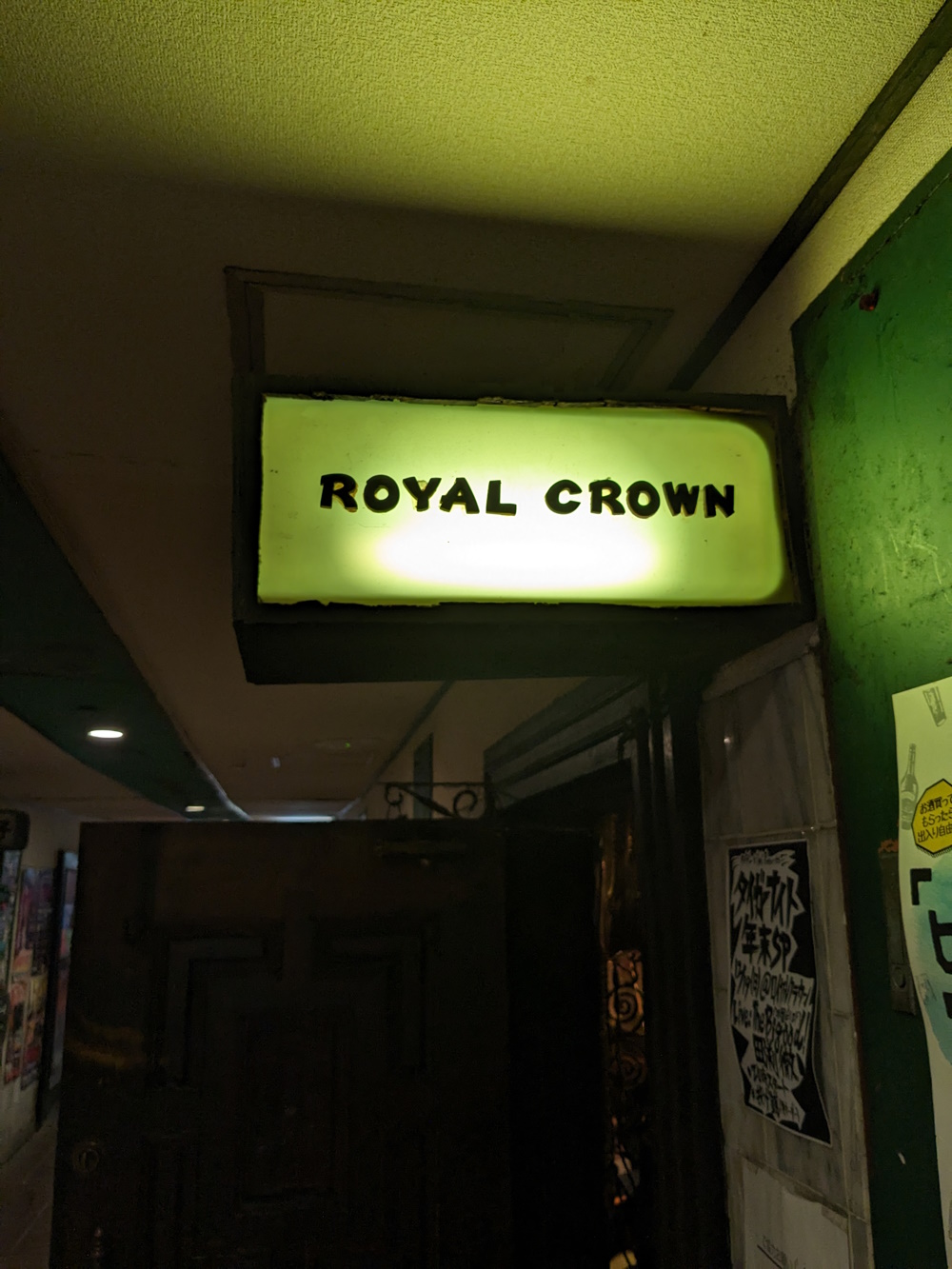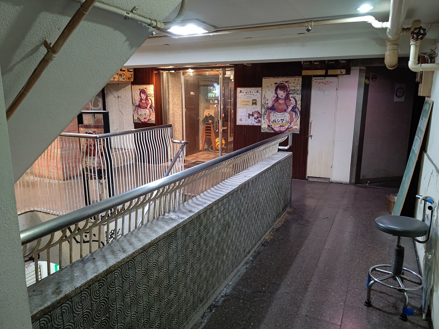 Lounge Caravan From the look of the map, this was once a large bar, like Encounter. It was over the stairs which lead down into the lobby of Universe (used, when I was going there, only as a fire exit). This one also had it's own outside staircase, which, by the time I was going, was the "weird little roomtm". I never saw this place open, it appears to have closed around 2015. I vaguely remember being told other bars used it to store stuff (Caoff Discovery's chairs would vanish when they had big, standing-room-only events, perhaps into there). You can just about make out "raunji..." on the sign, if you know katakana. The signs vanished between 2014 and 2015, though it's possible it also wasn't open in 2014! Relocation: Dunno, as it closed down years before the Misono did, I'm assuming no. |