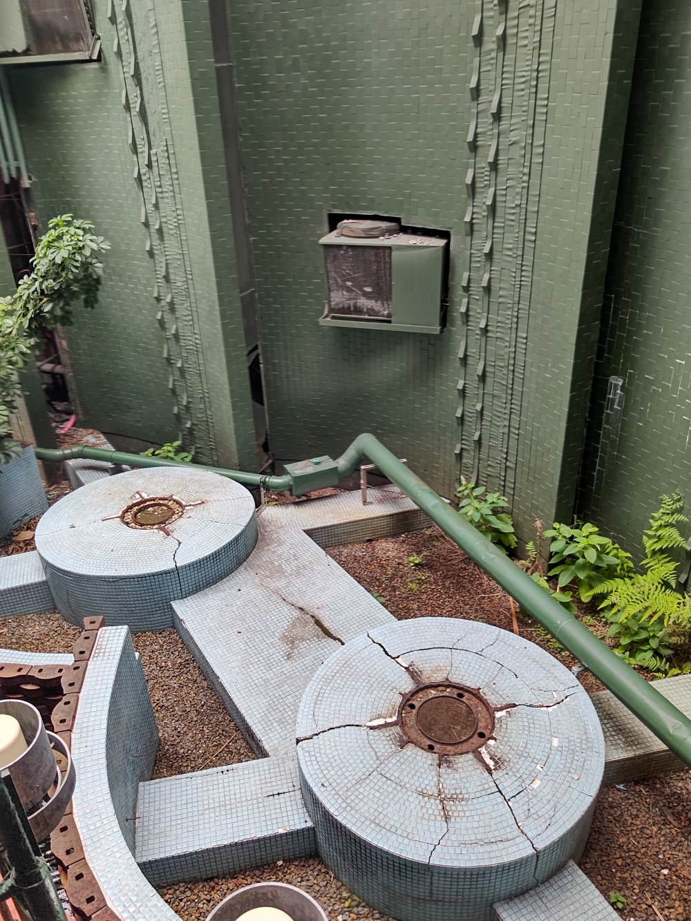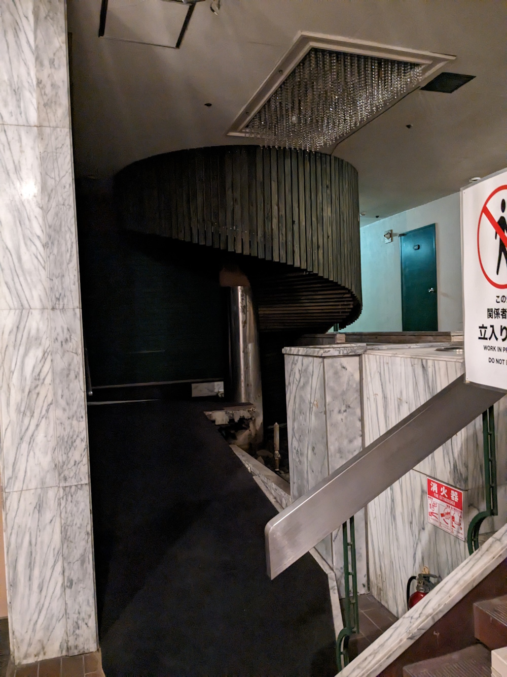 Third Floor This was the entrance to the sauna, and also a hotel. At the end of September 2019, the hotel closed, and was just left empty. There was also a small massage room off to the right of the lobby. This closed at around the same time as the hotel. The sauna seems to have closed much earlier, and was also just left empty. Just before the building closed, some architecture appreciation group did tours around it (oh, if I'd known!), the sauna seemed to be as it was when it closed - the coloured lights in the ceiling all still worked! When I first tried to go up the ramp I had some woman chasing me telling me there was nothing up there. I told her I just wanted to "take a picture", she still insisted there was nothing up there (honestly, I wasn't even expecting the door to be open, so I could already see more treasure than I thought right in front of me!), so I said I wanted to take a picture of the city from the top of the ramp, and she finally left me alone. Anyway, at that point I just took one snap through the door. But later on (and after I met some guys who had actually been in) I went in and got a few more snaps. I didn't pass the "Work in Profress" sign, but maybe I should have done. It looks like there used to be an extensive water feature up here, but it was deactivated. As are several other bits n bobs around the building that look like they were once fountains / cascades but are no longer in use. Osaka as a whole has closed down tons of water features. There used to be one near Kyobashi Station that was like a giant circular shower, now it's just a crappy concrete mini-stonehenge with some holes in it. There was also a pretty river / cascade / waterfall thing near (ish) to Hi Hi Town (which had it's own defunct water feature under the escalators), which is now only on a couple of days a year. There was even a long river / mini-waterfall thing leading to Osaka Castle which I saw in 2015. By 2017 it was full of dirt and had flowers planted in it. What gives? |