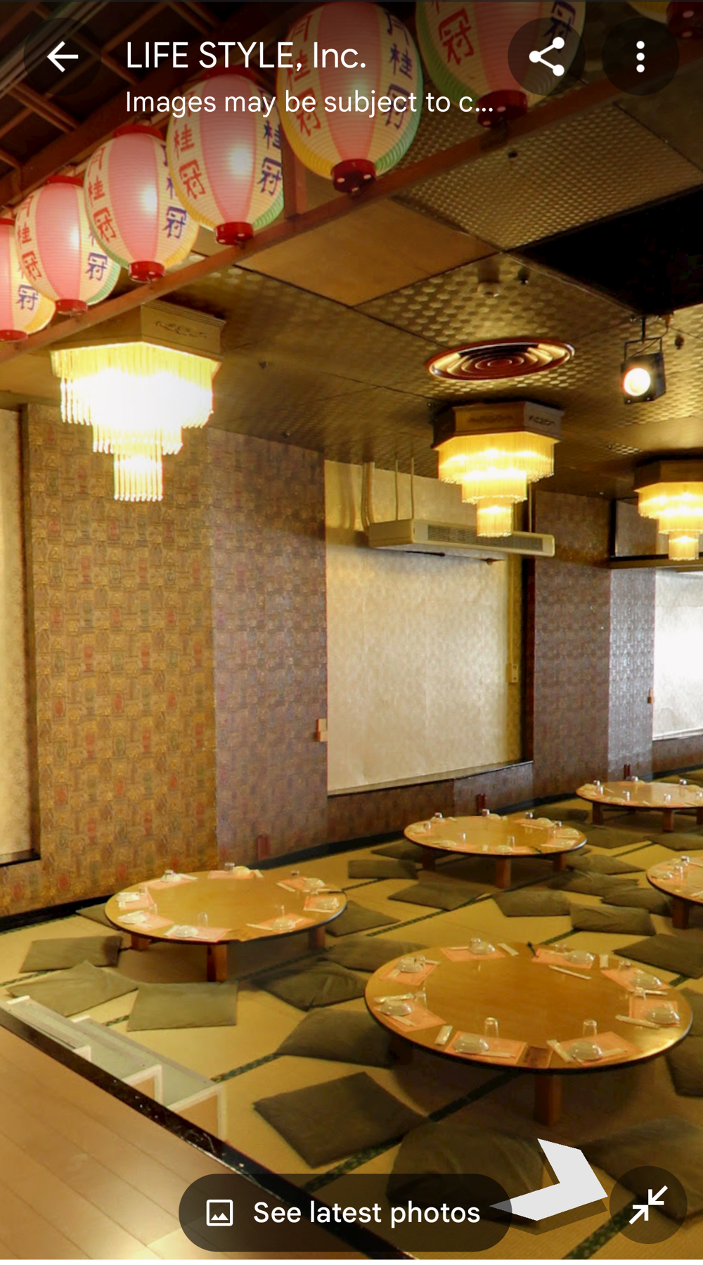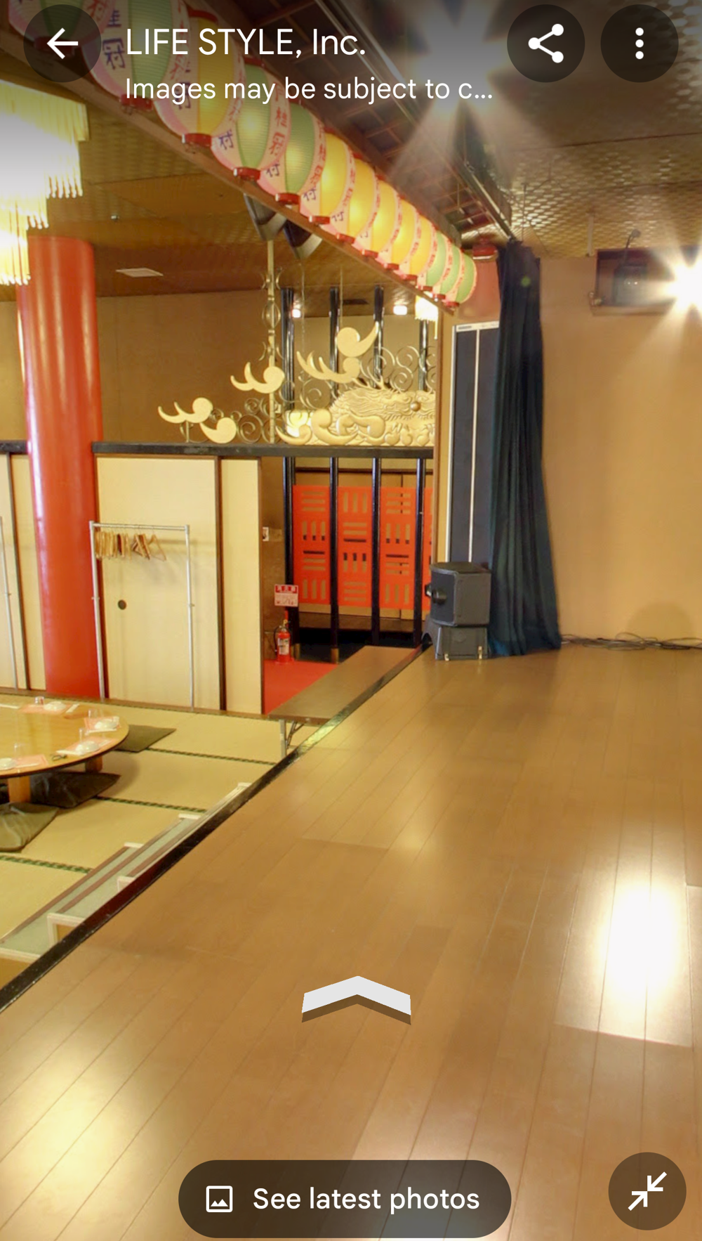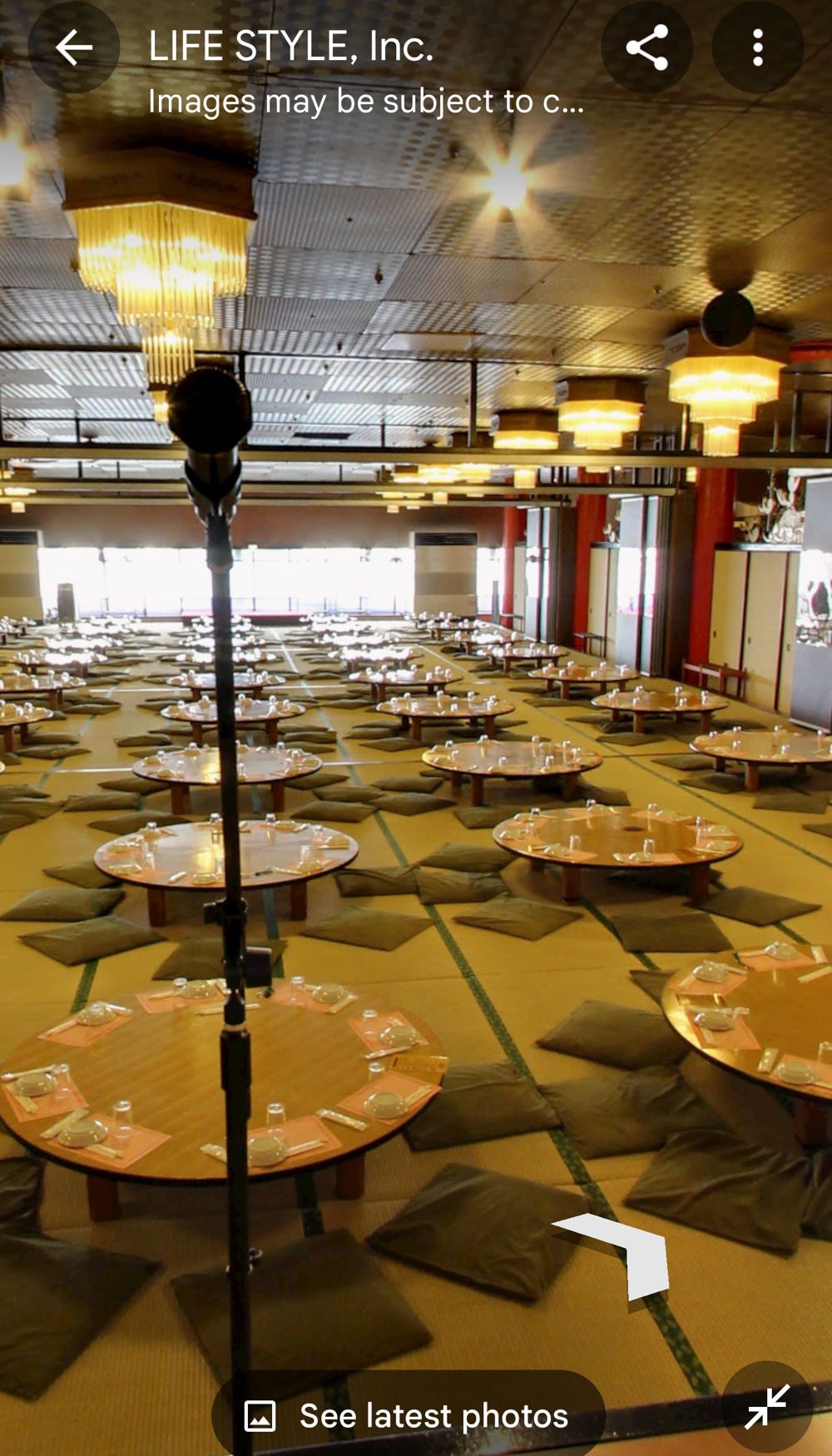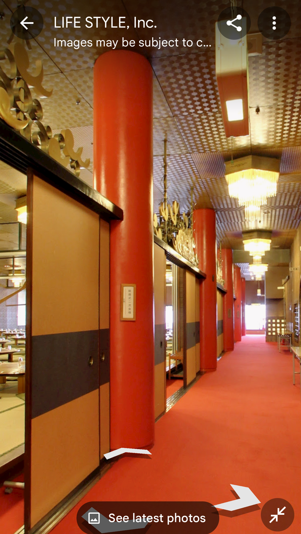 Fifth Floor This had the "banquet hall". These seem to have been a lot more common in Showa times, but I don't think many exist now (In 2015 I went to one in Tokyo with a band I'd seen, when very drunk, it was fun). Basically they're like a giant izakaya, with big circular tables that seat 10 or so people. Parties or corporate groups go there and get all-you-can-drink (nomihodai), and all-you-can-eat (tabehodai). These days those sorts of parties tend to be held in places with seperate rooms for each group, but in the old days it was all in one huge hall, so you'd all end up having a laugh with strangers around you, too! Taken from: https://brutus.jp/osaka_misonobuilding/ This section closed around the time of coronavirus. I never went, but Google Maps had an extensive tour of it. This will vanish one day, so I took an extensive number of screenshots! July 2025note: Today, if you try to access any of the Misono's internal photo-spheres, they "helpfully" redirect you to the "newest images", which are just pictures of the outside on normal streetview - so sorry, you already can't tour the hall as it was. They used to have a full walk of Motoko too, oh how I wish I'd capped that! |
