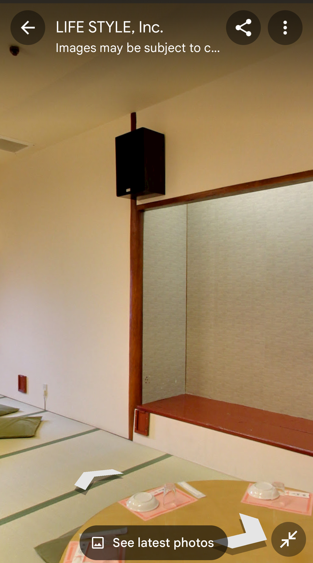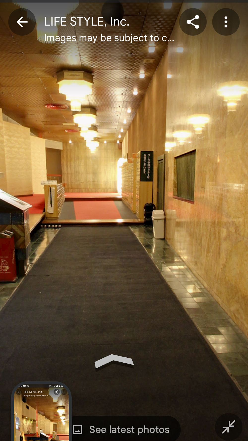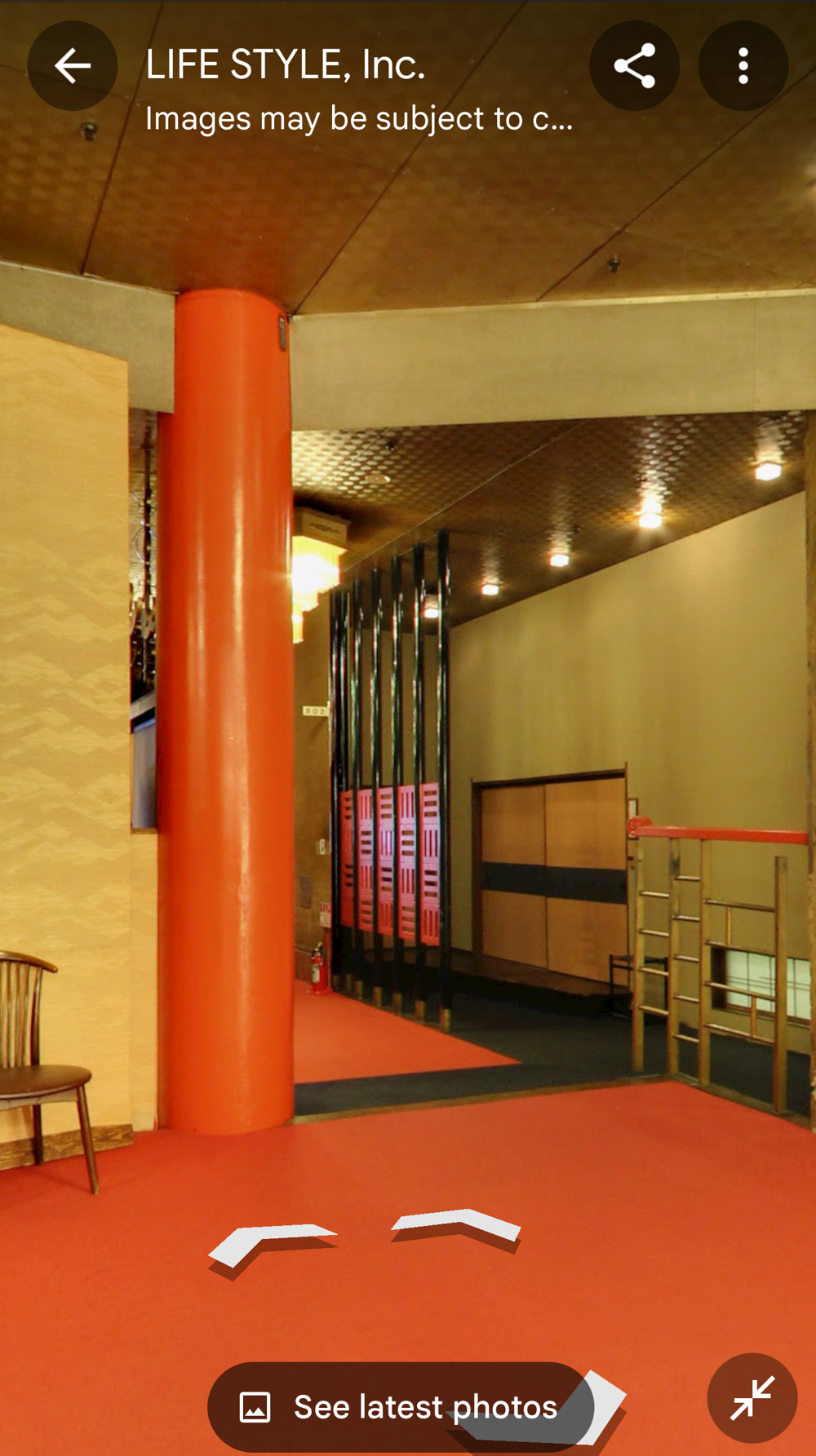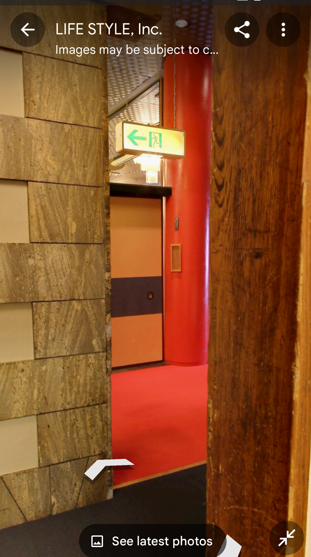 Fifth Floor This had the "banquet hall". These seem to have been a lot more common in Showa times, but I don't think many exist now (In 2015 I went to one in Tokyo with a band I'd seen, when very drunk, it was fun). Basically they're like a giant izakaya, with big circular tables that seat 10 or so people. Parties or corporate groups go there and get all-you-can-drink (nomihodai), and all-you-can-eat (tabehodai). These days those sorts of parties tend to be held in places with seperate rooms for each group, but in the old days it was all in one huge hall, so you'd all end up having a laugh with strangers around you, too! Taken from: https://brutus.jp/osaka_misonobuilding/ This section closed around the time of coronavirus. I never went, but Google Maps had an extensive tour of it. This will vanish one day, so I took an extensive number of screenshots! July 2025note: Today, if you try to access any of the Misono's internal photo-spheres, they "helpfully" redirect you to the "newest images", which are just pictures of the outside on normal streetview - so sorry, you already can't tour the hall as it was. They used to have a full walk of Motoko too, oh how I wish I'd capped that! |