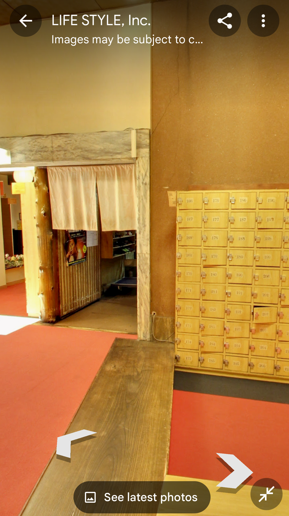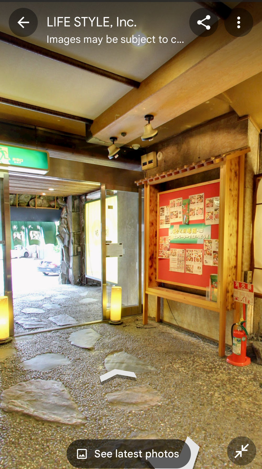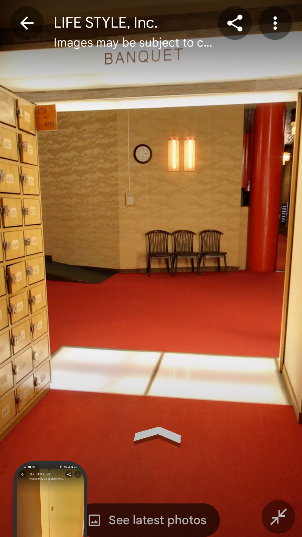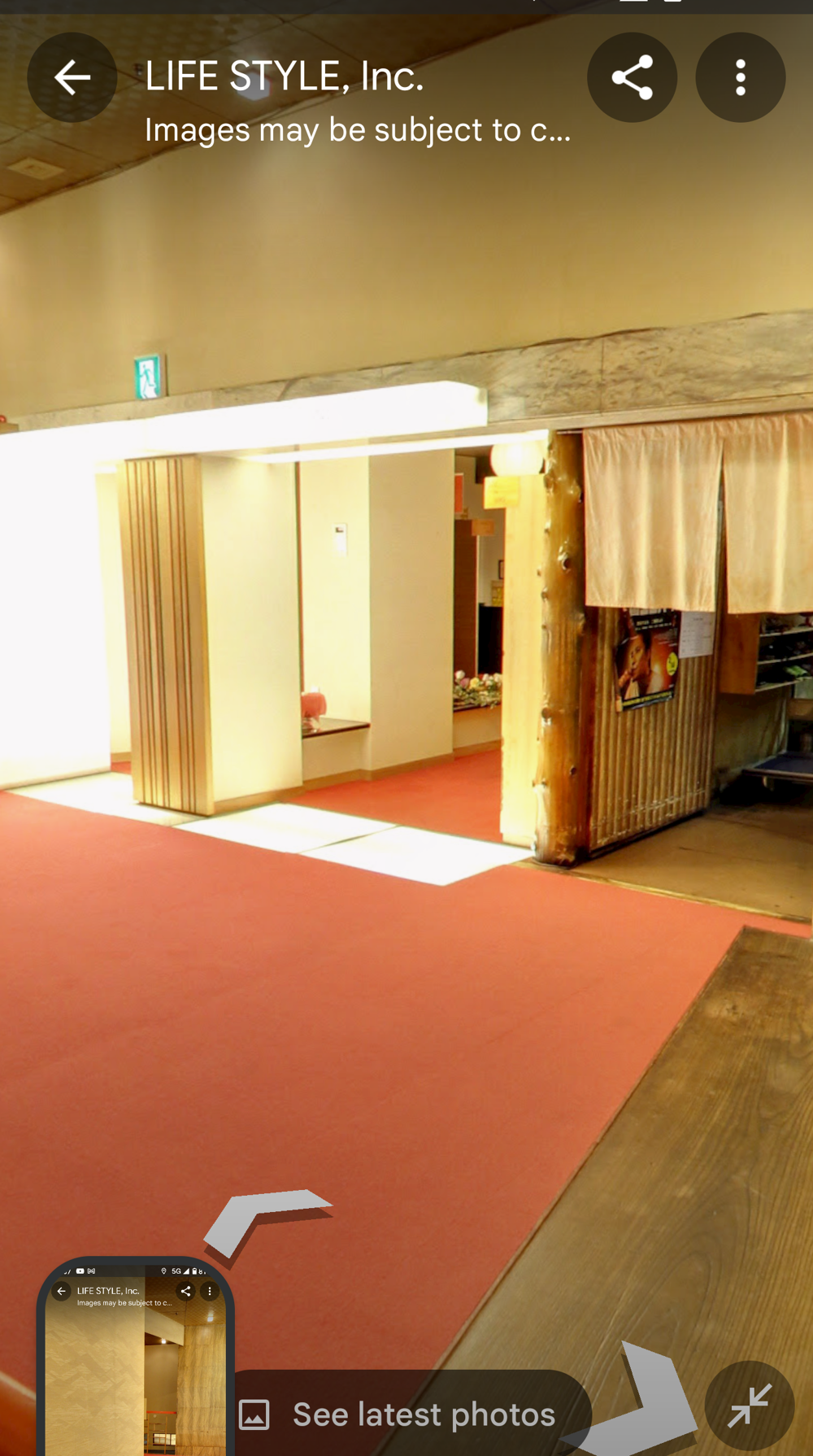 Fifth Floor This had the "banquet hall". These seem to have been a lot more common in Showa times, but I don't think many exist now (In 2015 I went to one in Tokyo with a band I'd seen, when very drunk, it was fun). Basically they're like a giant izakaya, with big circular tables that seat 10 or so people. Parties or corporate groups go there and get all-you-can-drink (nomihodai), and all-you-can-eat (tabehodai). These days those sorts of parties tend to be held in places with seperate rooms for each group, but in the old days it was all in one huge hall, so you'd all end up having a laugh with strangers around you, too! Taken from: https://brutus.jp/osaka_misonobuilding/ This section closed around the time of coronavirus. I never went, but Google Maps had an extensive tour of it. This will vanish one day, so I took an extensive number of screenshots! July 2025note: Today, if you try to access any of the Misono's internal photo-spheres, they "helpfully" redirect you to the "newest images", which are just pictures of the outside on normal streetview - so sorry, you already can't tour the hall as it was. They used to have a full walk of Motoko too, oh how I wish I'd capped that! |