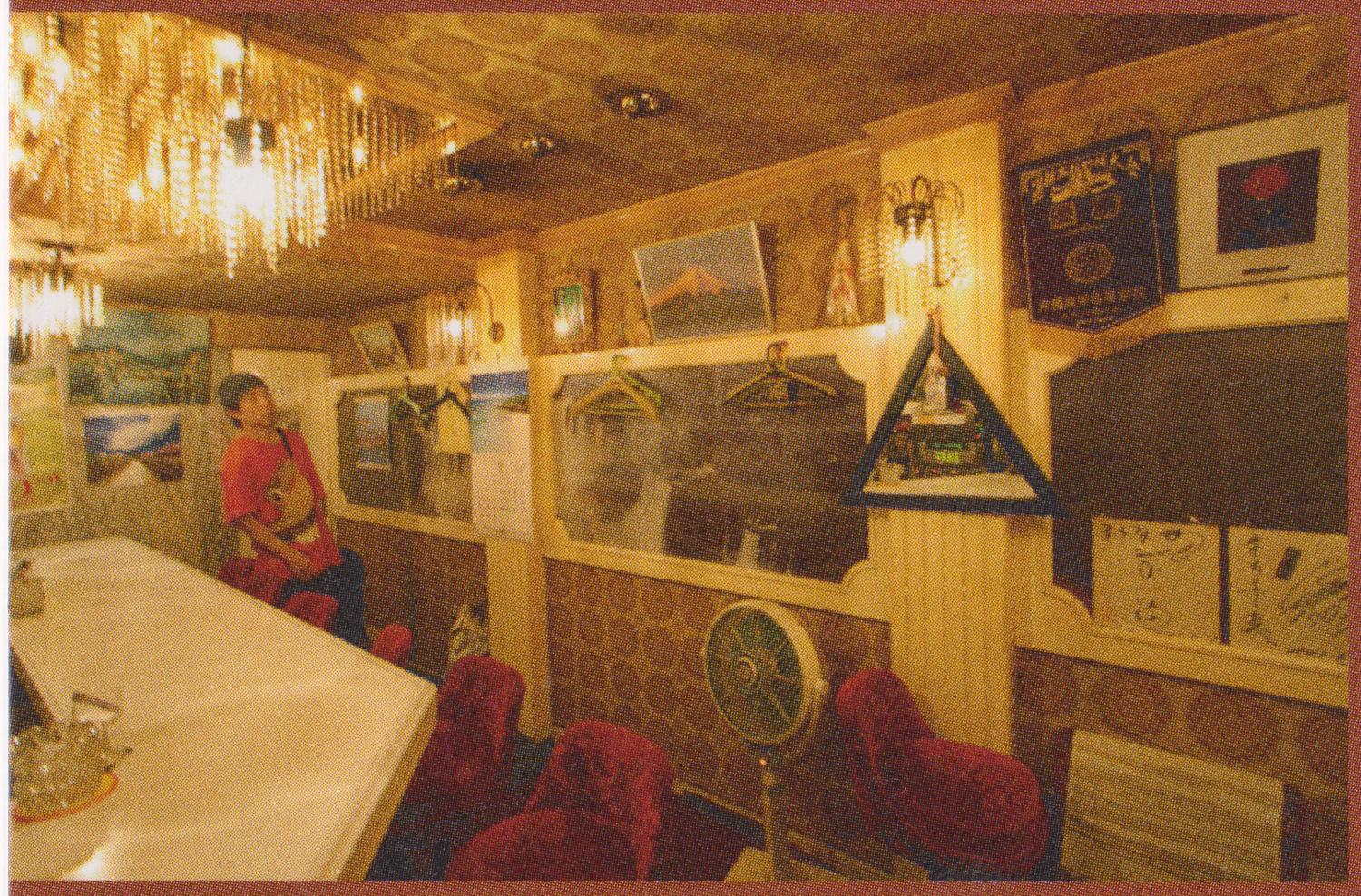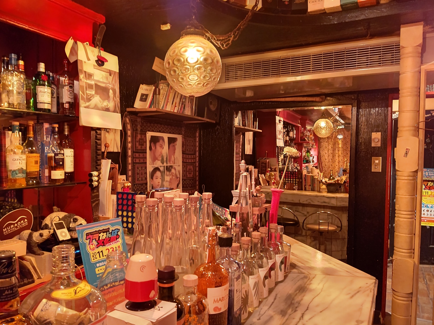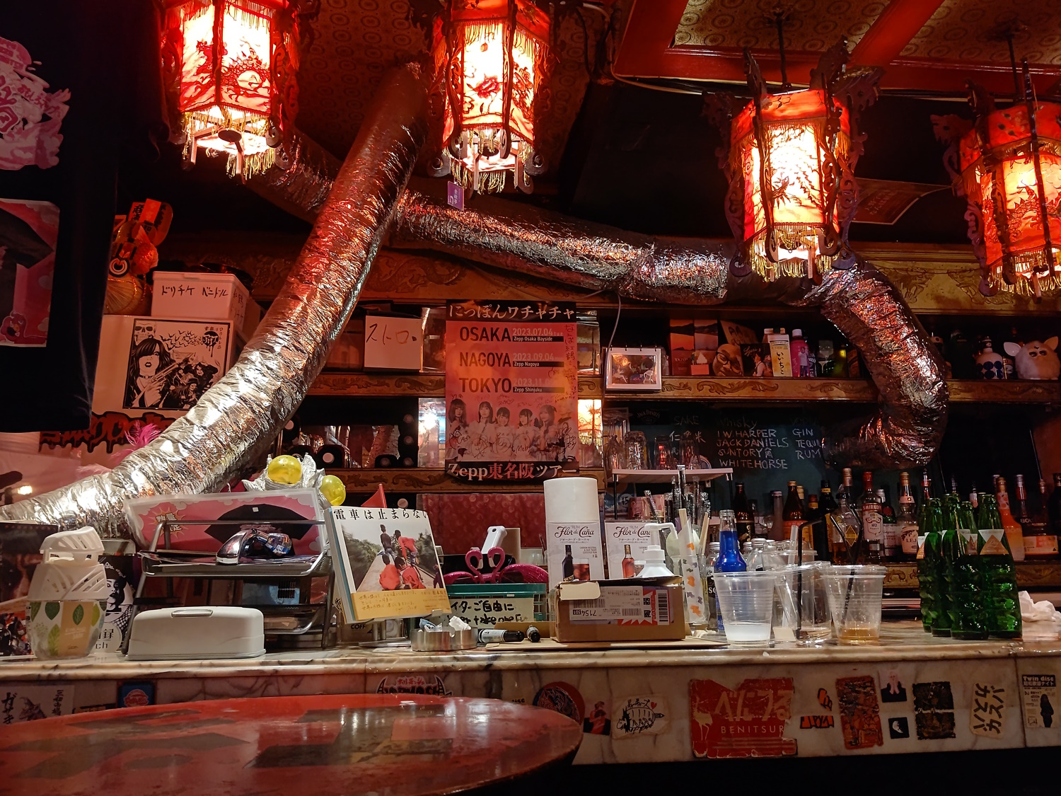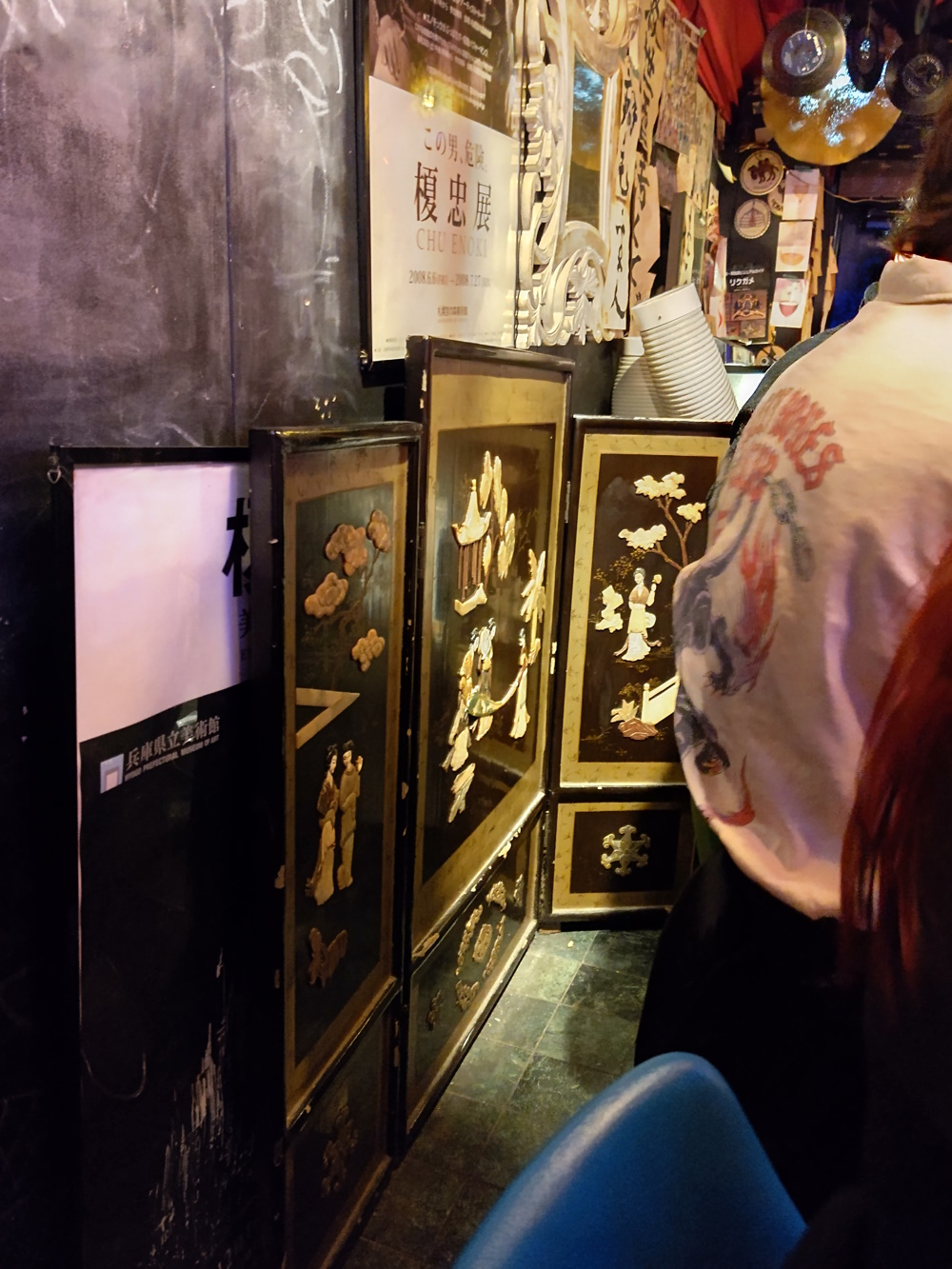 ZZ Bar A rock bar, mostly, but he'd play other genres if people mentioned them. I mistakenly beleived I was "fired" from my part-time-turned-full-time I had over summer 2024 (it was complicated), and drowned my sorrows (wait, happiness!) here. I met some Filipino-Yanks who were very, er, enthusiastic. The guy had a TON of records around the walls, a bunch of old audio equipment, and even a clockwork gramophone! He played this for us too, going "It'su Showtaimu!". I went here once more when it was in the Misono, and then also to it's new location. The decor was the carved-wood-and-bead-chandeliers "Chinese" style, hinting that during the 1980's "themed after countries" period, this place was supposed to be part of China, or somewhere with Chinese cultural influence anyway. Relocation: This bar has relocated to the "K's Spot" building, in Fuse, which is fairly far out of central Osaka. Watch those train times if you want to get back to your hotel! Fuse is a big station, though, so you'll find a taxi... but it'll cost ya! The new place is smaller but a lot cleaner / "newer" in general. He has a load of 45rpm records stuck around the walls. |
