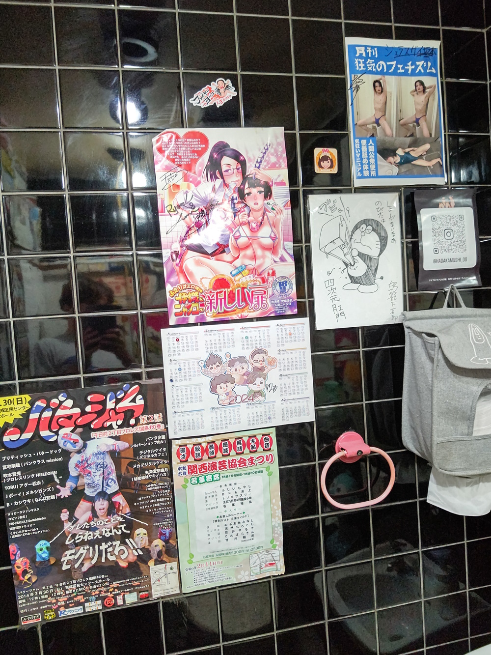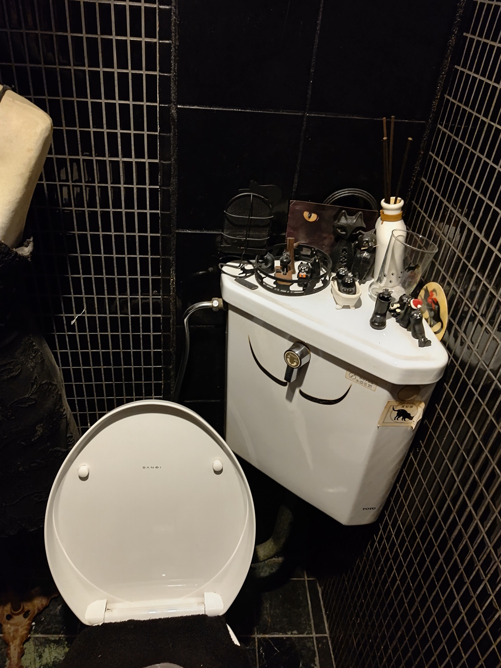 5-6th July 2025 The last night, I was too broke to really go, so went to a cheap otaku bar called Kuronekodo instead. Also the last performance was loud, grating harsh electronica with strobe lights and traffic cones, not really my sorta thing. Anyway, a black mural appeared on the white wall leading to the Universe entrance, and also the water feature was reactivated. |