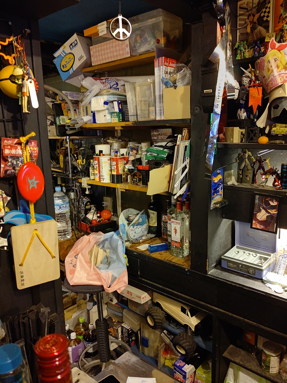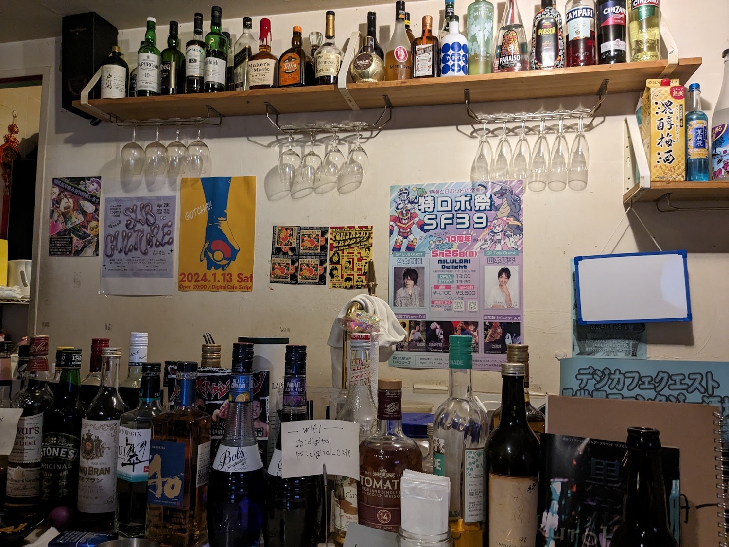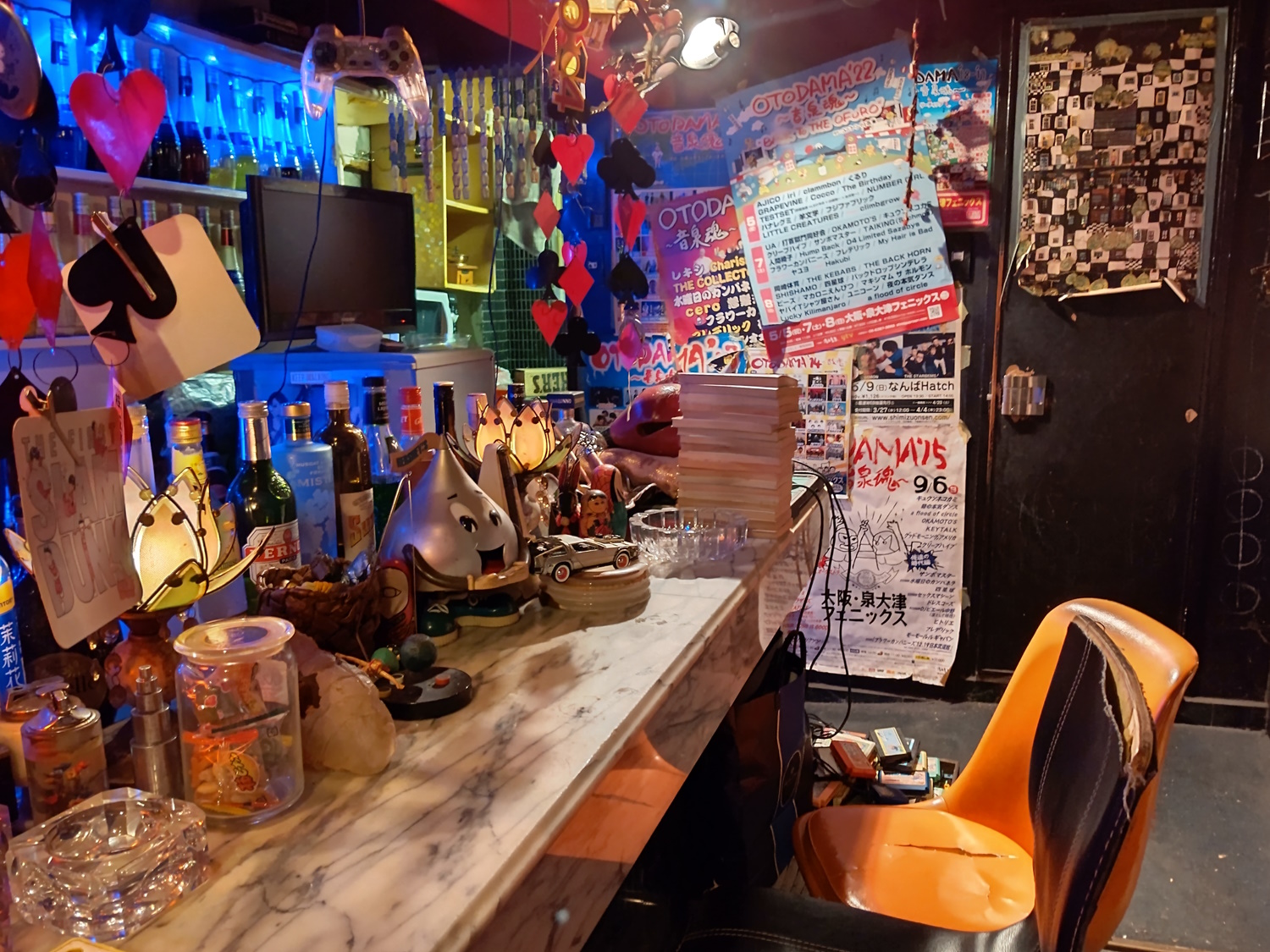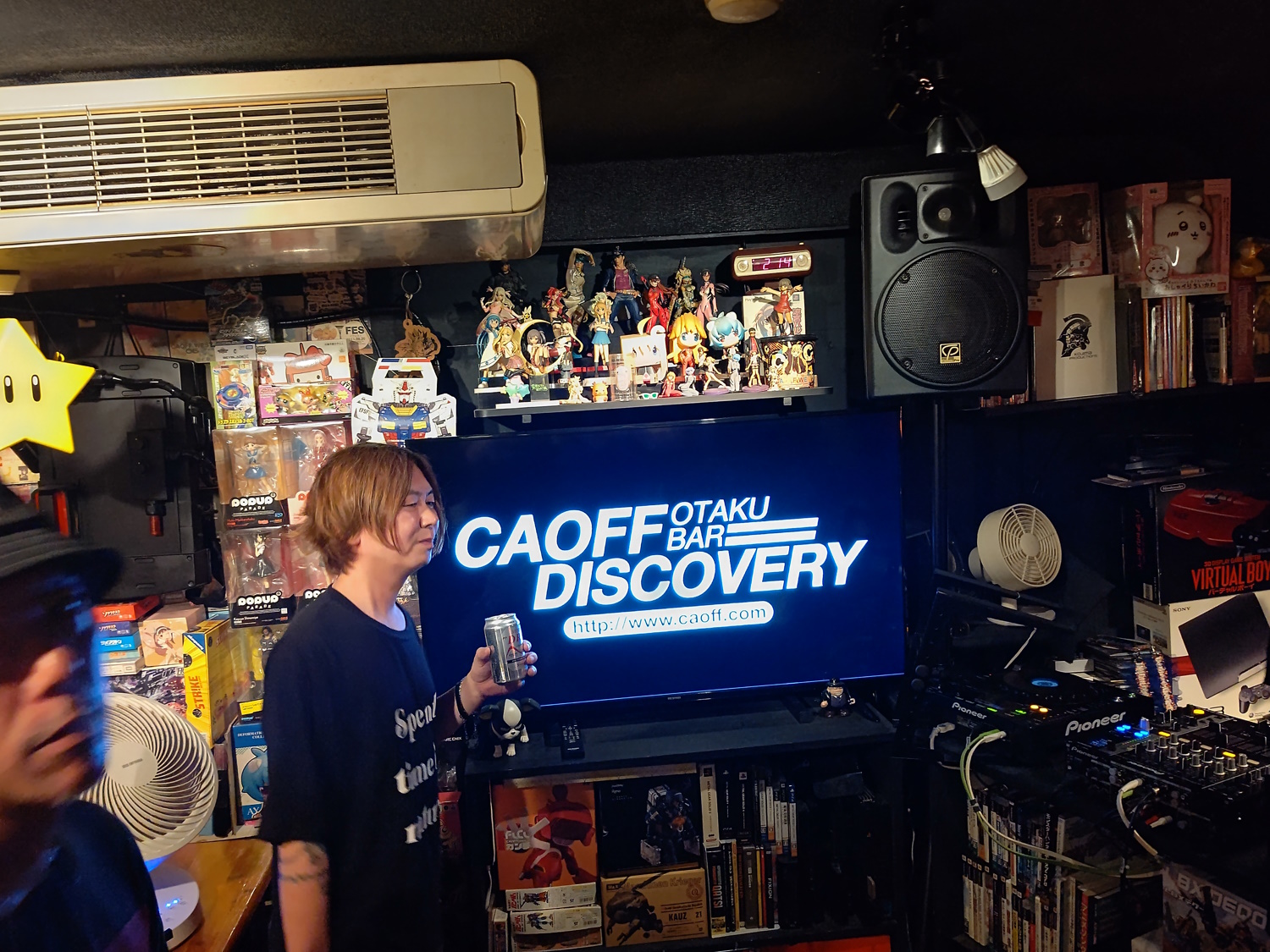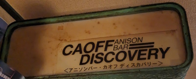 Caoff Discovery This is the bar I visited the most, as you can no doubt tell by the masses of pictures! It was an otaku bar, where they played anime songs - either playlists or requests. They even played ELO's Time! If ya know, ya know. The usual saturday mama was Miu McCartney, who also does anime song DJ events around Osaka, she did some in Benitsuru. It's also associated with the Caoff West anime song club night, which I beleive pre-dates the bar, and began in 2001! They did DJ events right in the bar, too, for which they moved out all of the tables and chairs, those were good fun. I did the new year there three times in a row, including, of course, the very last night! It was also something of a hub for other otaku bars in the (very) local area. The masters and mamas of Digital Cafe, Anna and Warp Room would drift in on nights where it stayed open super late. There was tons of anime figures scattered around, which it reportedly took them ages to move out (the master of Kissa Zenigeba was telling me about it, like he and his 2 million posters are ones to talk). The floor was wood, and raised up from the entrance. Presumably underneath the wood there were the white marble tiles found in various other bars. Relocation: Yes, to the Sun Plaza Building! Aran is over there too. They actually "relocated" in November 2024, I went and got all maudlin, thinking it was the last-ever night for Caoff in the Misono. Then a week later I walked past and it was still open! For about 2 months there were two Caoff Discoveries. |