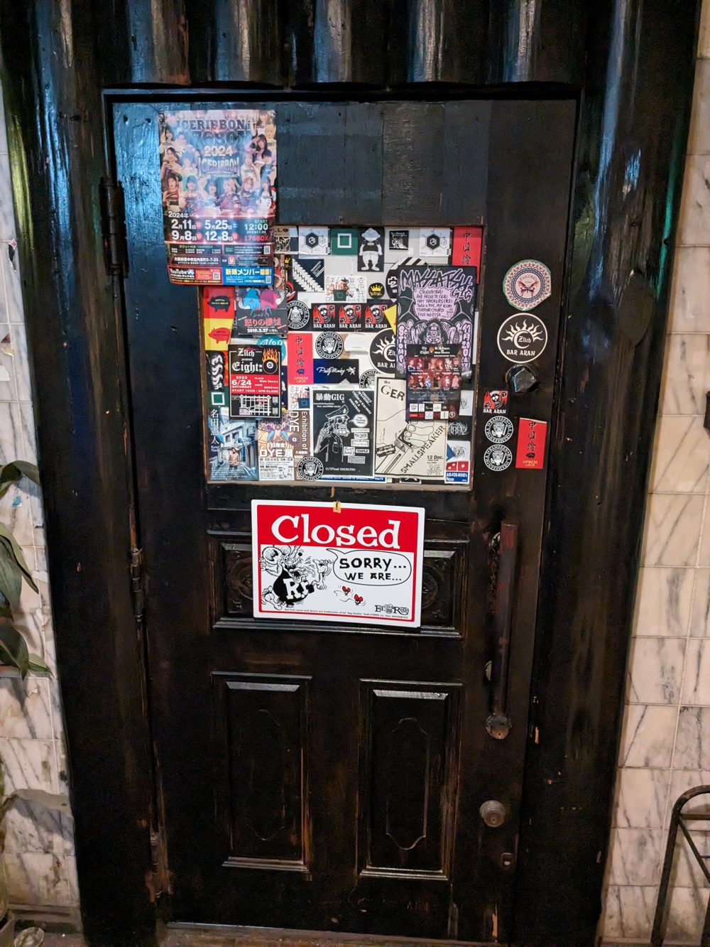 Aran: This isn't Aran's name! ...probably. Left over from a previous bar to use the unit? Either way, they took this sign with them, and put it up in the new place! The closest thing Misono had to a dedicated rock bar (Though ZZ bar was mostly rockin', too!), he played a lot of punk. There was also a bunch of "Rat Fink" merch around, tall tables with snacks you could stand at, and booths with couches and tables. He had some cool retro merch on the bar, like unopened J-rock and pro wrestling videotapes! I think one was even Beta! Also a good variety of whisky. The decor outside the door, and around the walls inside, slightly hints at it once having some sort of log cabin theme... maybe. Anyone remember line dancing being briefly popular in the late 90's? Maybe if that craze spread to Japan, this was a western saloon themed bar? Pure speculation, mind you! I met an Aussie here once and we hung out a bit, we also went to Meitai Kurabu. Relocation: The basement of the Sun Plaza building. The same building as Caoff Discovery! Whenever I go there I usually end up having a "Misono Crawl" round the two. The new Aran is bigger than the old one and has very high ceilings. Seems to attract a lot of gaijin. There was a tall long-haired Korean-American in there once I was hoping to catch the eye of. He could "kim" my "chi" any day... er, and some other cuties have been seen too. One woman saw a photo book about the Misono building and kept asking the master to take her photo, so she could be in "the next book". Previous Incarnation: Around 2011, when the Book was made, this unit was a place called Placebo, which served Guinness. |