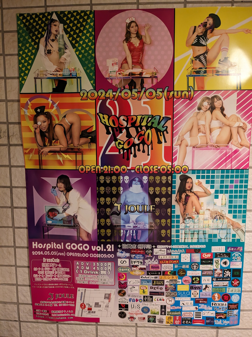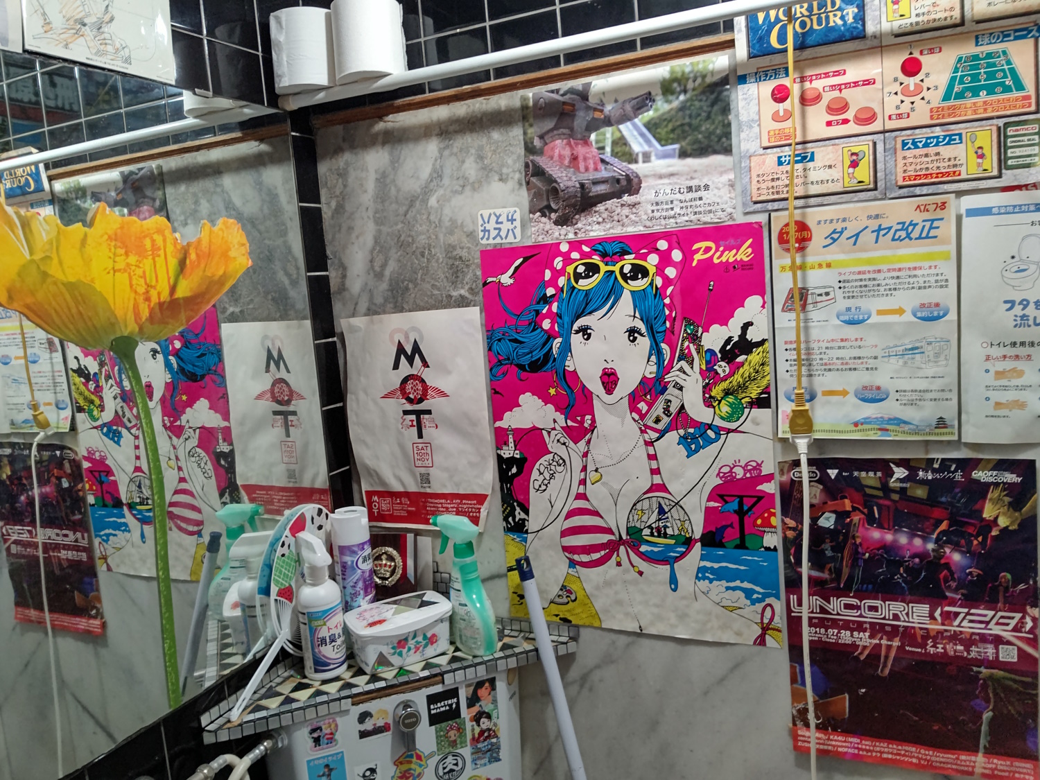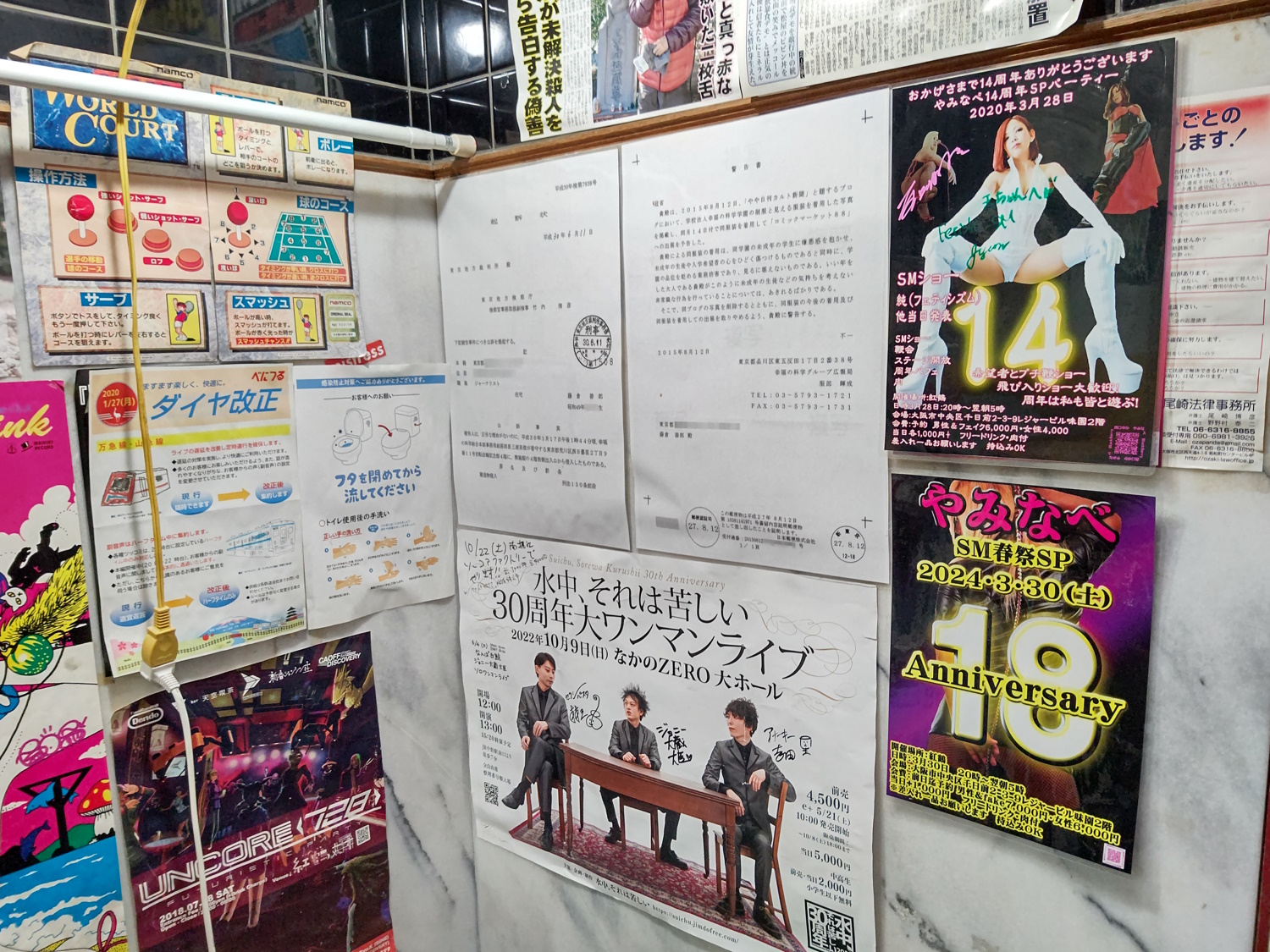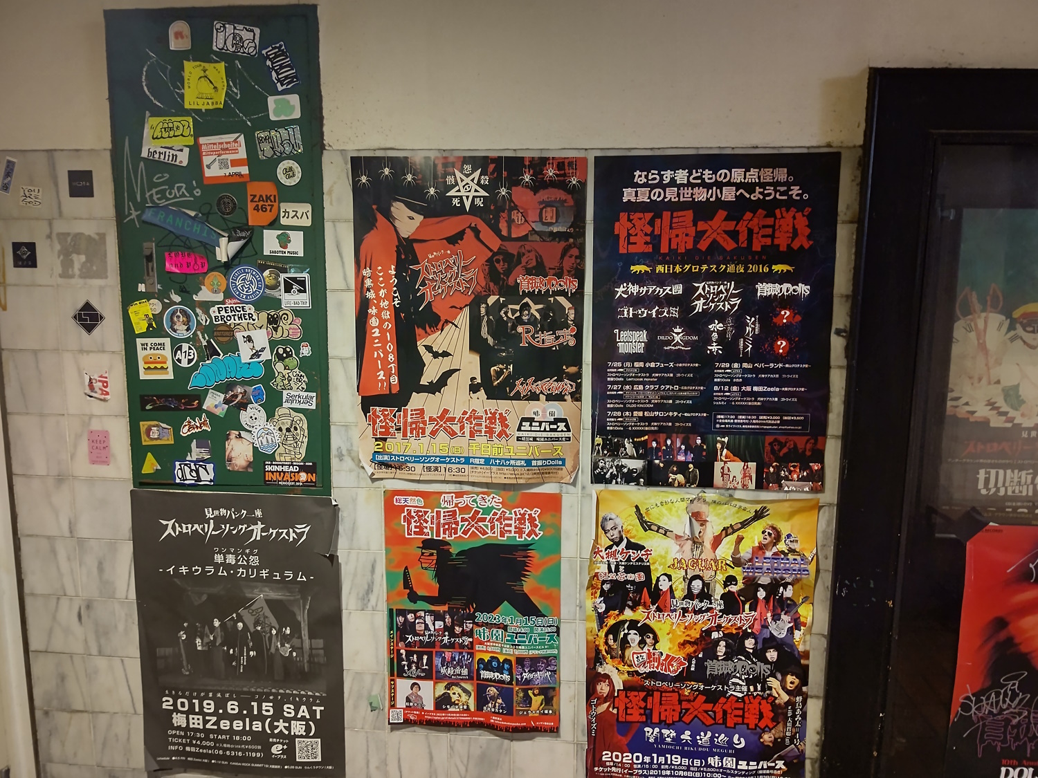 Taken from https://junkissa.jp/blog-entry-1772.html. It was taken in 2011, shortly after the cabaret closed. You can see the blank sign for Benitsuru, and the empty units that would one day be Daishojou and Aran. At some point in the early 2010's, the building began to take on a second lease of life as the home of Osakan subcultures. The cheap rent meant that many bars catering to rockers, artists, otaku, goths, punks, dark-electronica fans etc moved into the building. The second floor became an awesome place to be, with loads of posters, stickers and graffiti all over it. Most bars left their doors open, so visitors could see what they were like before going in. They also advertised their (cheap!) charges outside - this is very unusual in Japan. The open doors and cheap prices made it a great place to pub-crawl and meet new friends, or just hang out and drift from place to place, seeing what was going on. Scanned from the book. The building's new popularity as a "subculture" place even earned it a place on the silver screen! In 2015 a movie called "Misono Universe" was released in Japan. Though, for some reason, the English title was "La La La at Rock Bottom". Still, not as bad as the treatment Condorito got. It seems to be (as I haven't seen it yet) about some high schoolers finding a guy with amnesia near their school. He turns out to be an amazing singer, and eventually finds some measure of fame in Osaka, performing at Misono Universe. It turns out his amnesia is from a head injury, caused by a botched Yakuza hit. Now they know he survived, they're after him again! Loads of posters for the movie were put up around the building... and promptly got nicked. Apparently the owner actually had them print another batch just for him! These ones got stuck down good 'n proper. CONDORito, guys. It's right there in the name! The hotel on the second and third floors was, by now, looking rather tired and dated. It closed down in September 2019, joining the defunct sauna. At the end of 2019, the massage parlour on the third floor was also closed. In 2020, Coronavirus caused the fifth-floor banquet hall to close down. The popularity of big, "all in one room" izakaya, for multiple parties of strangers to be drinking at once, seems to have been waning anyway. The only things left were the second floor bars and Universe live house.