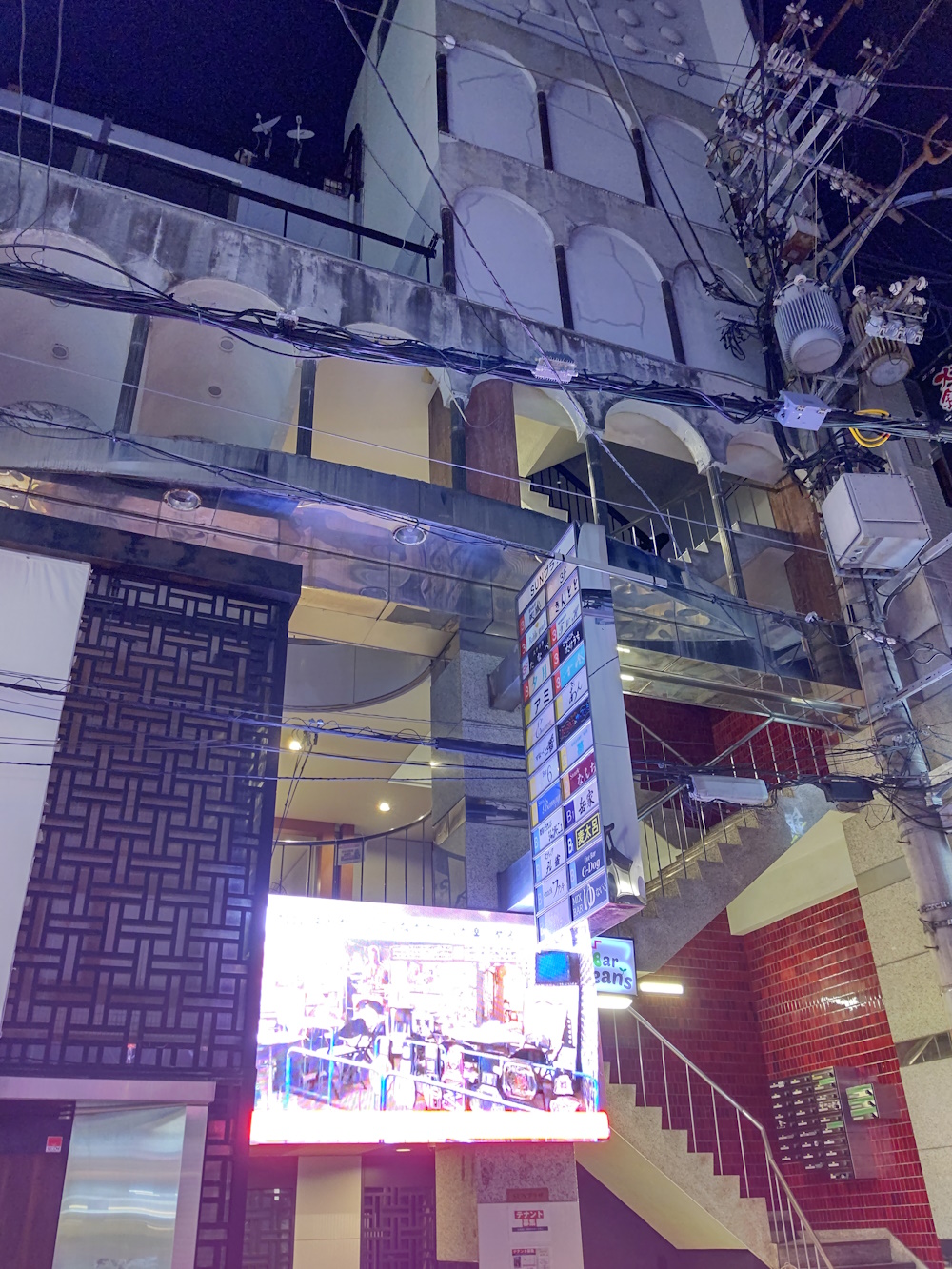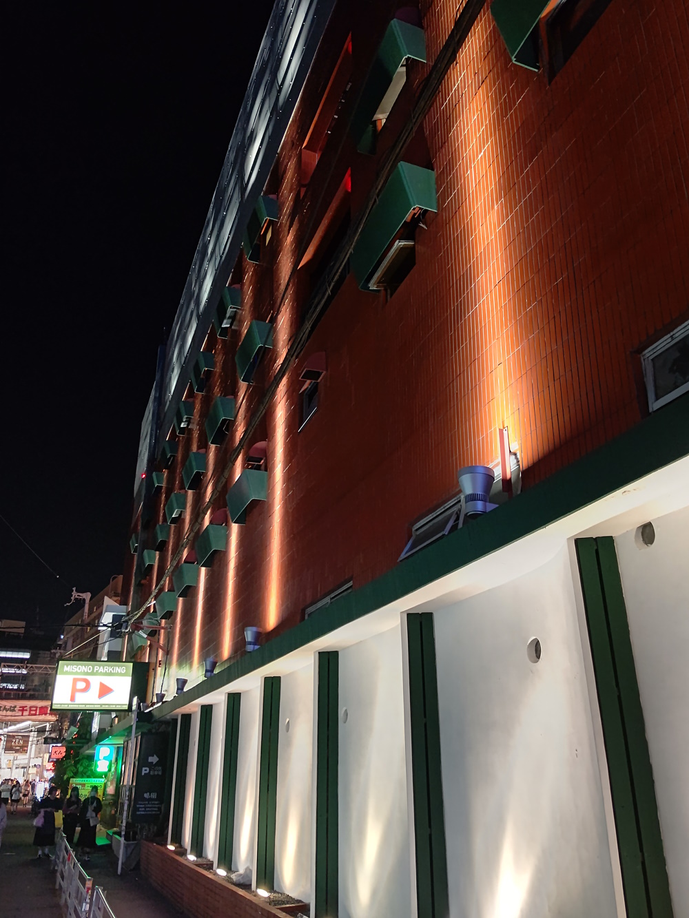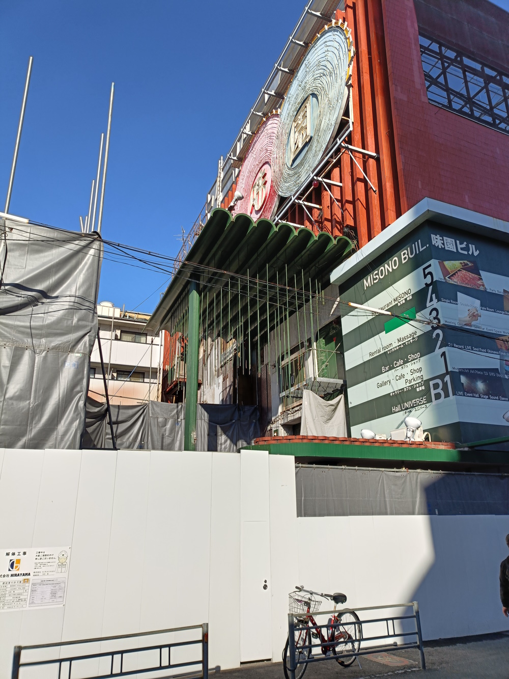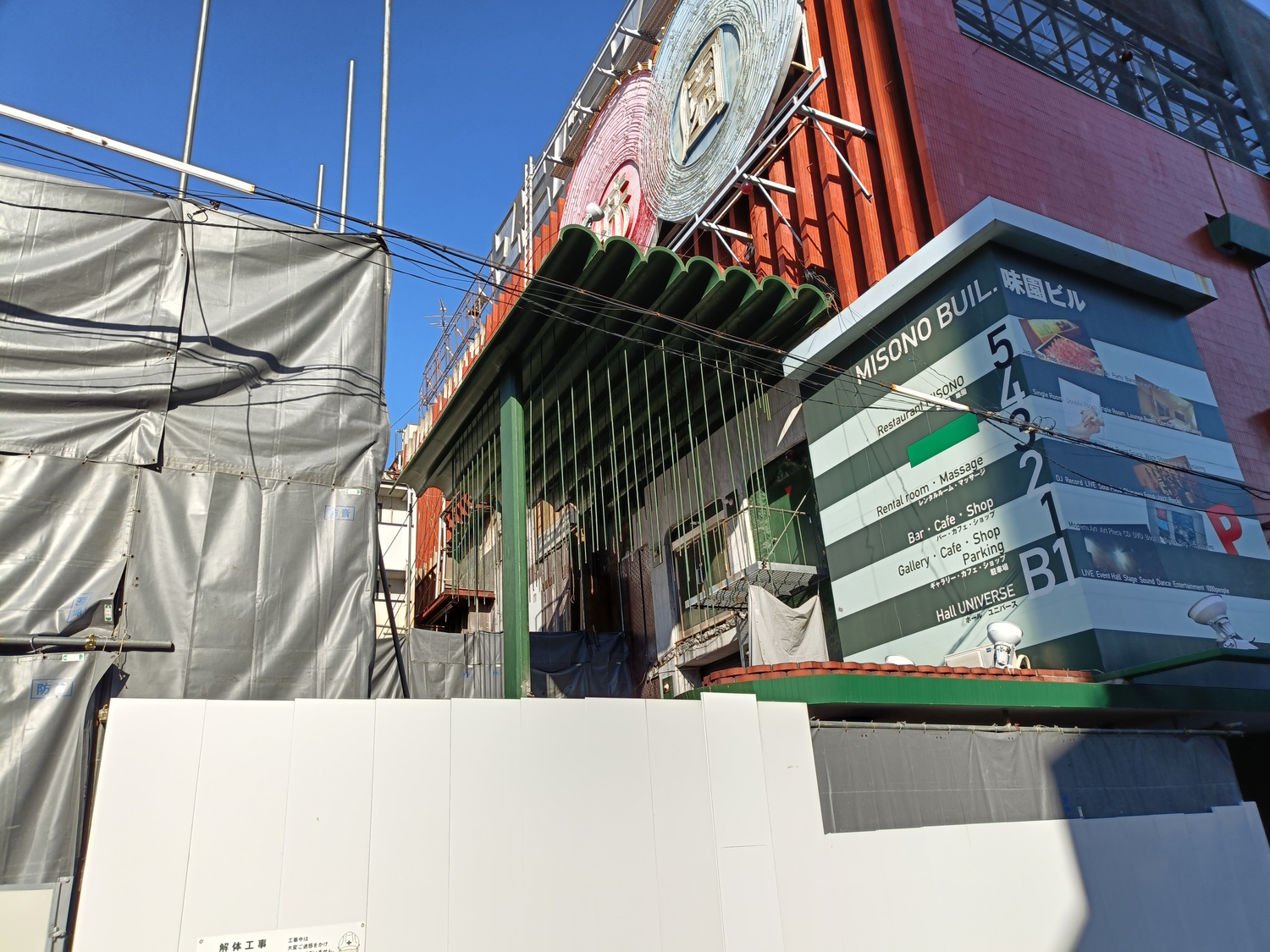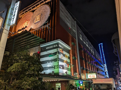 Taken October 21st 2023 The Misono building was the heart of Osaka's nightlife culture for 70 years. It opened in 1955* and closed in 2025. Originally, it had a huge cabaret club on the second floor, and a dance hall in the basement. There was also a "banquet hall" (more like a giant izakaya, usually used for corporate entertaining) on the top floor. The cabaret was reportedly the largest in Japan, with space for between 1000 to 3000 patrons, and between 500 and 1000 maids to wait the tables. The Universe was featured in Life Magazine, from the USA, in 1962. Scanned from the book. The stage was vast, and had two "UFO stages" which could descend from the ceiling, with dancers on. Other smaller stages would rise out of the main one, to lift dancers up. The entire stage assembly could also be raised to the ceiling, making way for a dance floor that patrons could use! Each of the booths had a red lamp to softly illuminate it, steel-and-glass tables built by the Misono's own staff, and waitresses were summoned by pushing a button, which raised a flashing orange light. These lights were actually trafficators from Chrysler cars! Scanned from the book. At this time, the exterior was grey, with various colourful, lit-up "planets" stuck on it, as befitting the spacey theme. On the roof, there was a revolving, colourful "atom". Inside the cabaret hall there was a false ceiling, with powerful floodlights above. The false ceiling had multicoloured, semi-transparent acrylic tubes poked through it, creating "stars". These would even have a degree of parallax as people walked to their seats! There was also a multi-storey car park at the rear, accessed through a tunnel. From: https://pointed.jp/2021/11/15/universe-1956/ There was a "virtual tour", using the Metaverse, of the original building at one point, but it seems to have vanished now. At some point between 1975 and 1980 (conflicting reports!), the cabaret club was removed, and the huge, 12m high, space, was filled in with three floors. This moved the banquet hall to the fifth floor. The second floor, once the floor of the Cabaret, now contained many small bars. Each of these bars was, at first, themed after a country (Osaka Expo '70 fresh in the mind!), and gave employment to former dancers who were at the big cabaret. The third and fourth floors contained a hotel, massage parlour and sauna. The Sauna had a "treasure cave" theme, with colourful lights. The bars and hotel rooms had white and green marble, some with ornate wooden carvings on the doors and pillars. Some of the bars kept this theme in later years, while others got remodelled. Scanned from the book. The Universe Cabaret moved into the basement, no more ascending and descending stages! An area at the rear of the basement was turned into ill-defined "salons", which appear to have been named "miss(country)". Bars with sexy foreign barmaids, perhaps? As the 80's dawned, the basement had it's former cloth ceiling replaced with metal tiles. The cabaret part was made into a disco named Studio 80 (partly because it was 1980, and partly to "one up" a disco called Studio 50 in New York). This had a "house band" who would perform every night. The "Salons" at the rear were replaced by karaoke rooms, themed, like the bars, after countries. Later the disco changed it's band, and was renamed Studio 82. In the 90's the basement returned to being a cabaret.