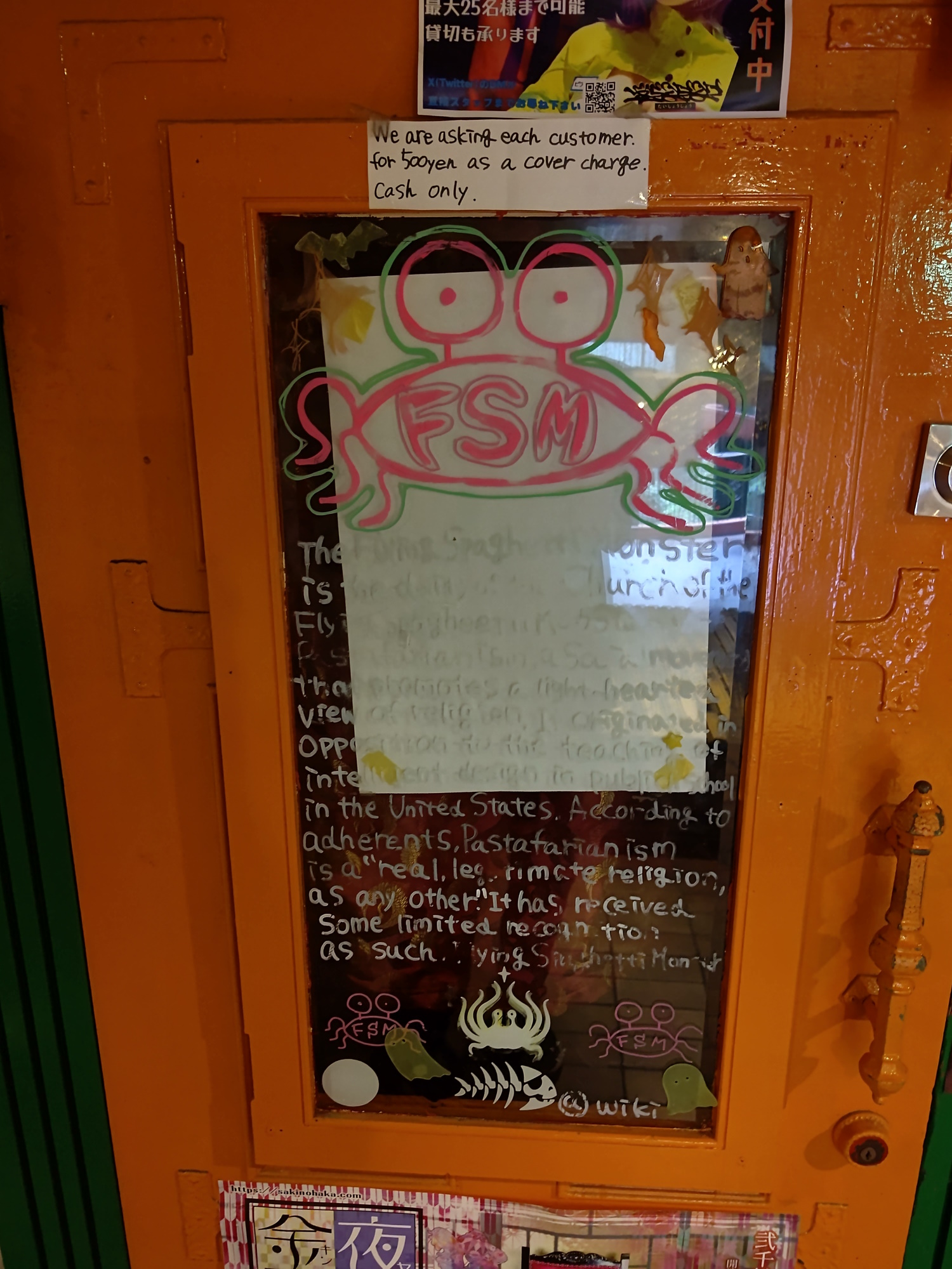 Daishoujo: It had a bunch of "shop dummies" in (that's what my babe-unborn innocent mind is gonna keep calling them!), dressed in cool "cosplay" etc. It also has what looks like a graffiti'd copy-paste from the Wikipedia article about the Flying Spaghetti Monster on the door. I only went here twice, and was pretty drunk both times, so I don't remember much else. The decor, in keeping with several of the other bars at the western end of the building, was very Chinese. They still used white and green marble for the floor and counter, though. When the small bars first opened, they were themed after countries, several of them had "Chinese" decor, even in later years, so may have been themed after regions of China, or else also Vietnam etc. The owner of the building apparently also beleived strongly in Feng-Shui, which considers green to be lucky, and explains the green marble and accents around the building. By the time I went there, they'd repainted the ornate wood carvings with orange and white accents, in an attempt to colourful it up a bit. Relocation: Dunno. Previous incarnation: In August 2015, it was a restaurant called Aka-Okami, which had a "wild game" theme. You could even eat friend scorpion! Information from https://www.hotpepper.jp/mesitsu/entry/1508065. Which also has pictures I'll rip one day. |