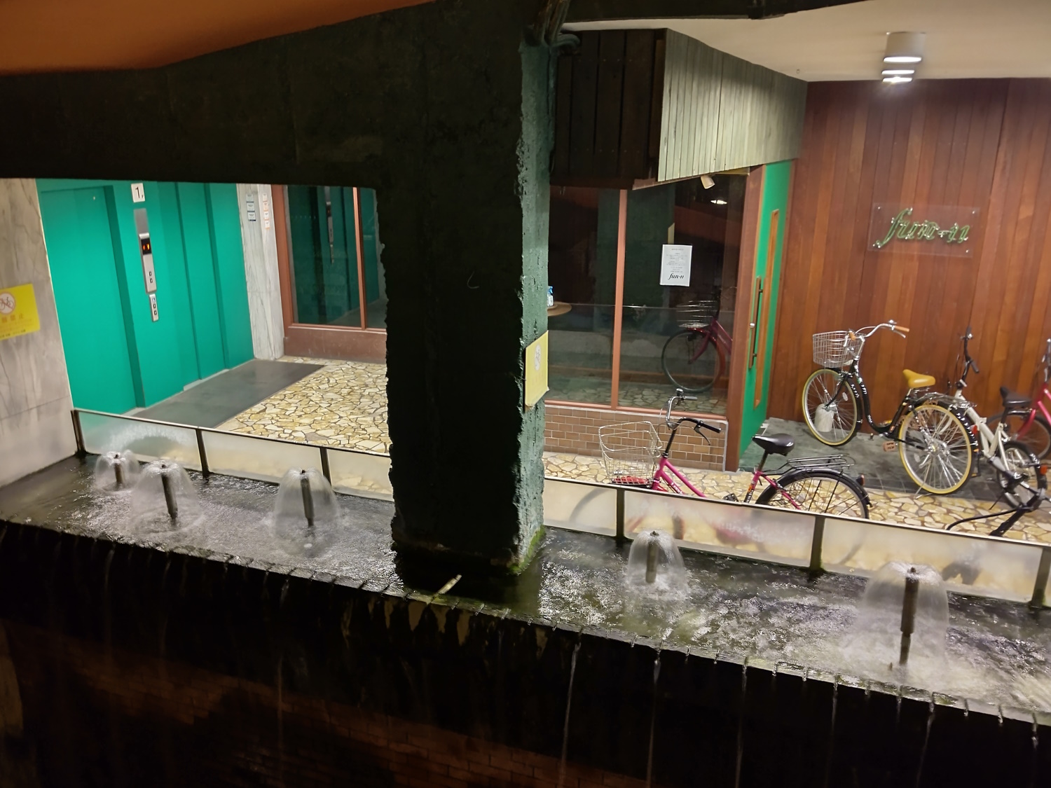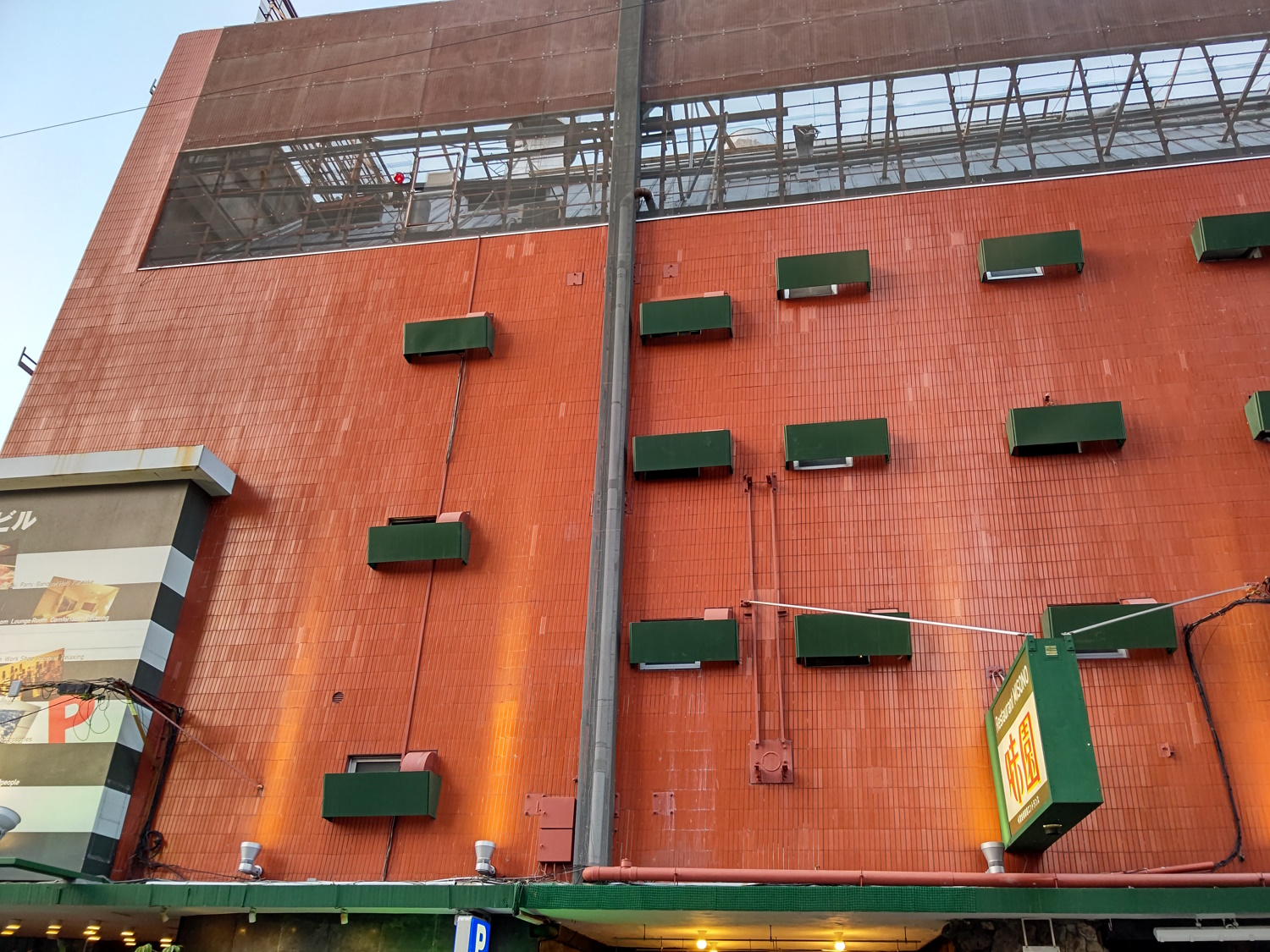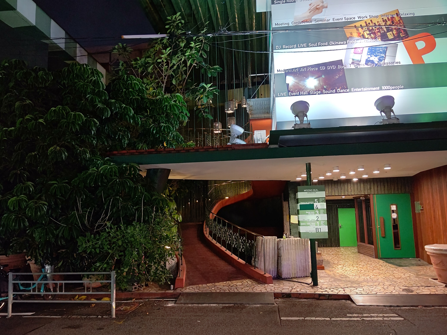 From Wikipedia, taken in 2013, but it looked much like this in the 80's, too. The western entrance, once a white marble hallway leading to (I assume) lifts or stairs up to the second-floor cabaret, was opened out, had water features added, and was fitted with a spiral ramp up to the second and third floors, as well as lifts from the first to fifth. The outside was repainted red and green, and the planets removed in favour of more conventional signage. Next to the lifts was an area which was many things over the years, initially it was a small supermarket! Later it became an art gallery of sorts, a "museum" for the Misono building, and finally a bar. In this form, the building operated for many years, attracting people for all sorts of purposes. It was popular enough that it was even advertised on TV!