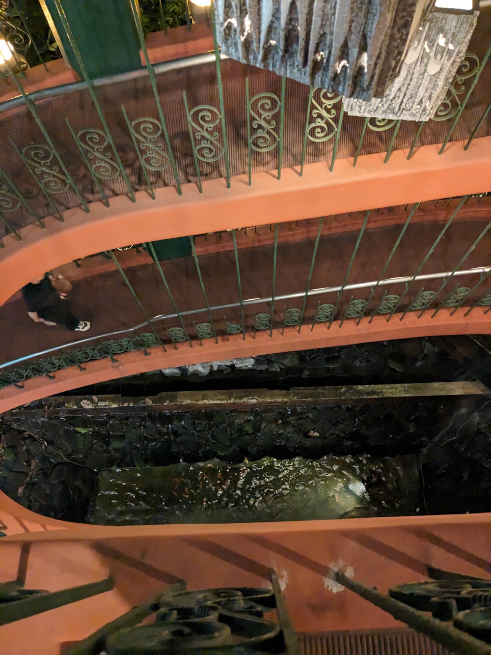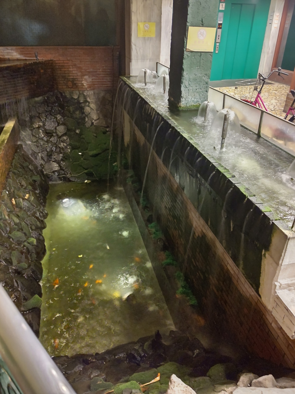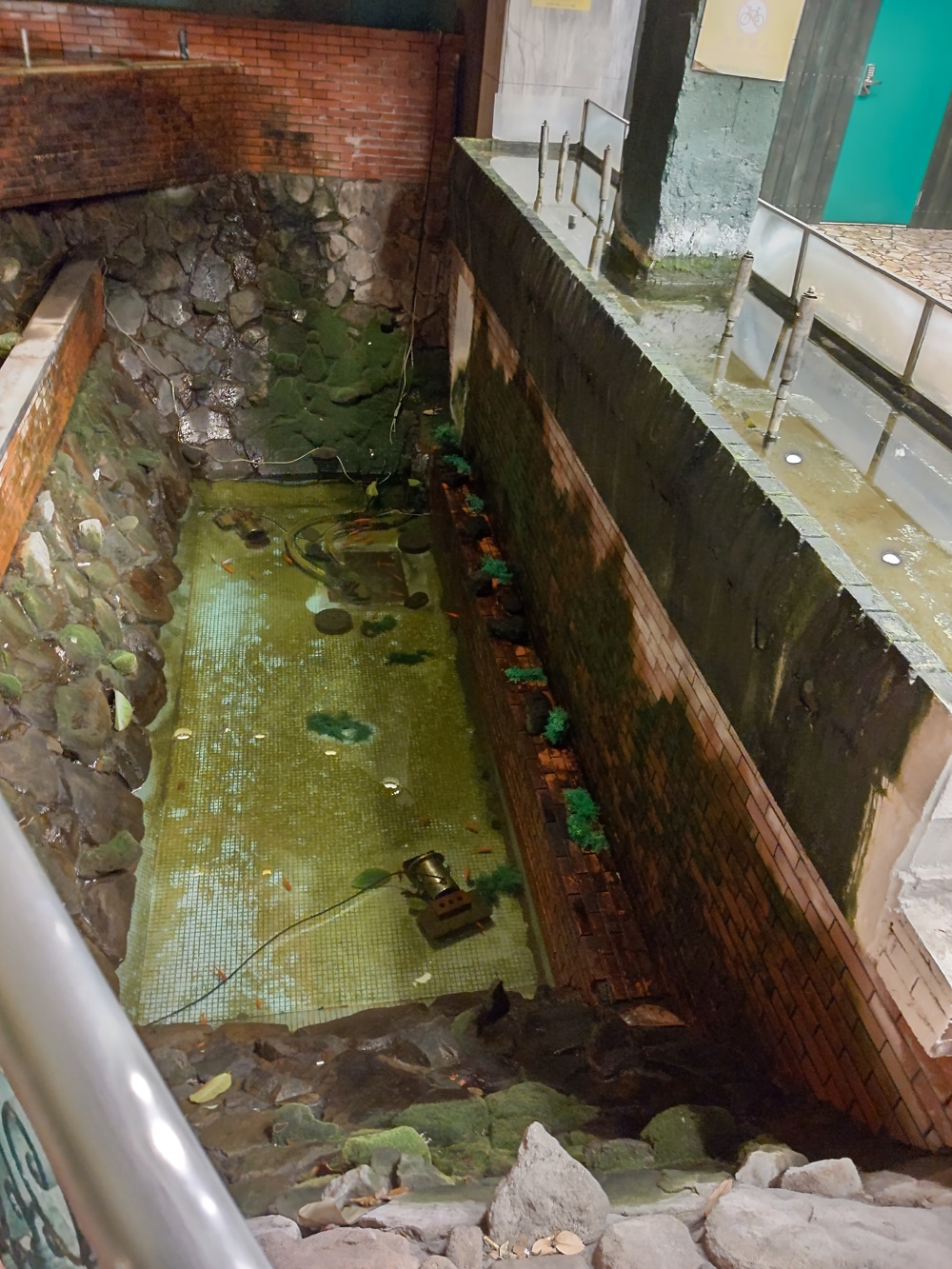 From the Youtube channel "Astalot117", https://www.youtube.com/watch?v=9zcw5nWNSsc&t=87s As the years went by, the building's popularity waned. The supermarket disappeared at some point. The karaoke rooms behind the cabaret were closed and the area was not used again. The sauna was closed down next, early in the twenty-first century. By 2009, the second floor seems to have been mostly empty and deserted. Reportedly one of the corridors wasn't even lit, for a time! The country-themed bars were long gone, as their barmaids retired or moved on. The units were rented out to tenants, but business was not brisk, beyond a handful of snack bars and dodgy massage parlours. In 2011 the Universe Cabaret in the basement closed down (and even before that, was no longer on every night), the space became a "rental hall", for other live performances. It was used for a lot of raves, punk and metal concerts, and so on. Apparently there were electrical issues, and the air conditioning in bars at one end would be very weak if other bars were also using theirs (when I was going, several bars at the western end used plug-in, "one hose" air conditoners, not the ones built into the building). Lots of the water features were also shut down (this is true of Osaka in general!), the only evidence for their existence rusting pipes poking out of things.