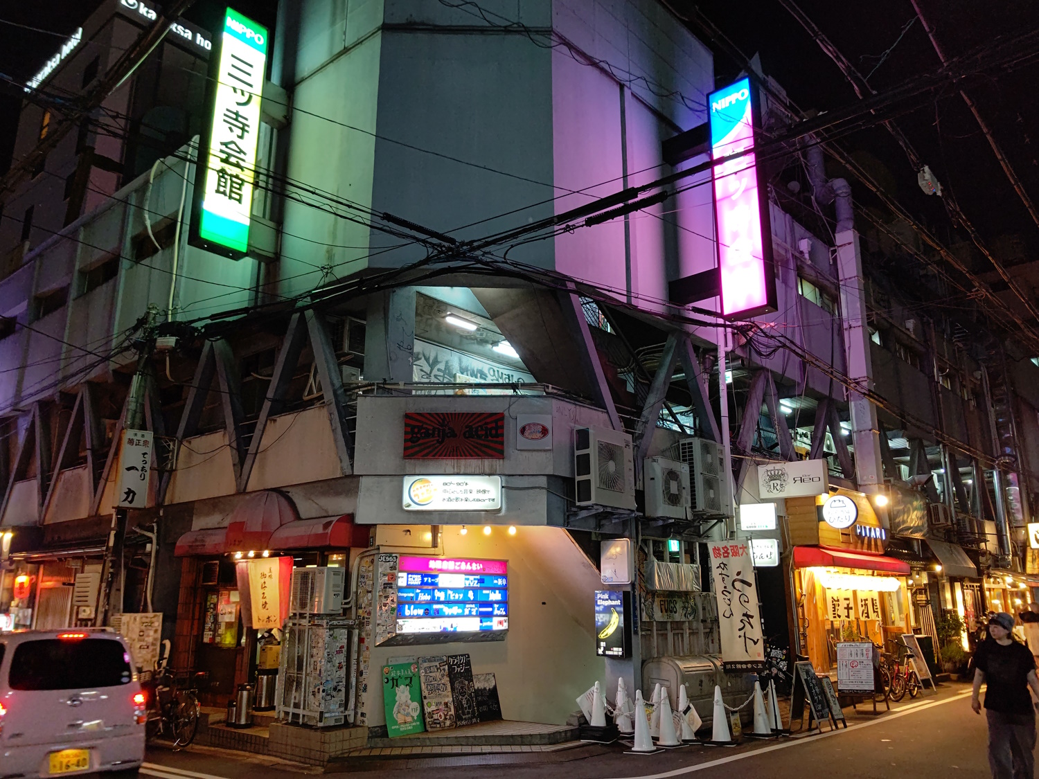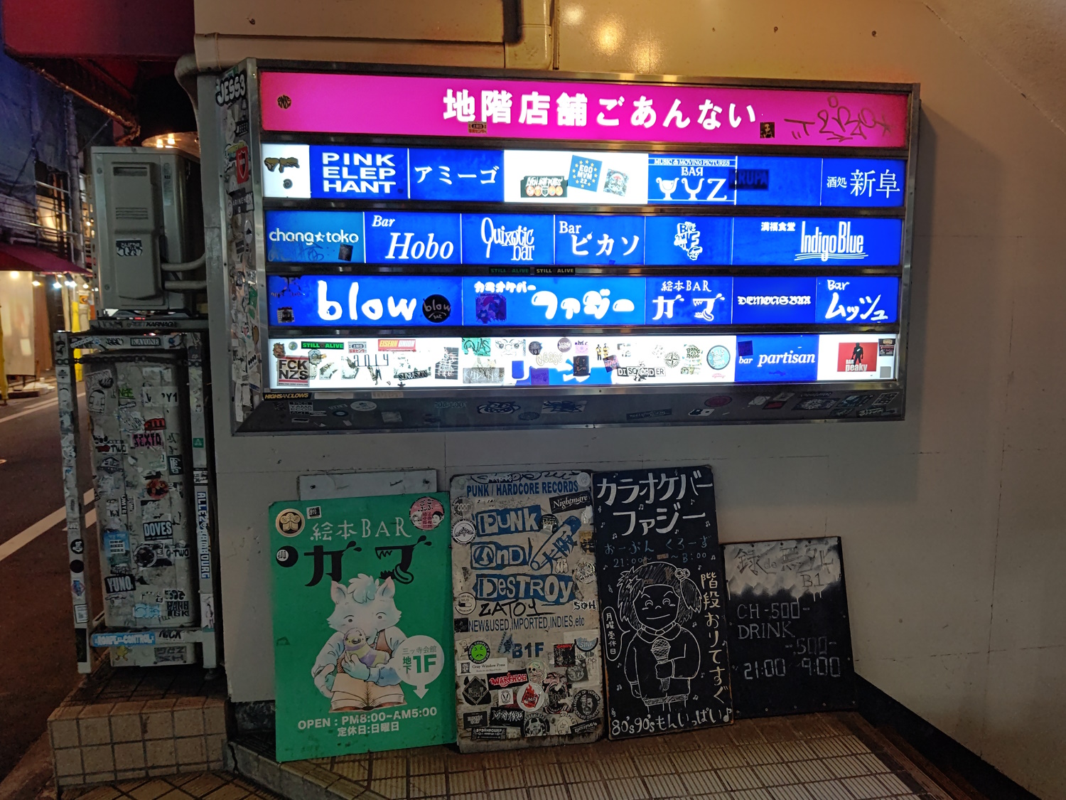 Mittera Hall A few people on *spit* Reddit suggested this place as the Misono's most immediate "replacement". For once I'd have to agree with them! It has one big business (a snooker club on the top floor, with a seperate entrance), and several tiny, wierd bars over the other floors. I used to frequent (and still occasionally go to) Rock Bar Plant, in the basement. This is cheap and awesome, the mama speaks English and plays AC/DC all the time. There's also a shop selling punk rarities in the basement, which is open during the day. Upstairs is a bar called Ganja Acid, which sounds very strange, but fun. I'll visit it one day - it also sells Canabeer, which is delicious. There's also a gaming bar a bit like Dendo, only with more variety in consoles (another gaming bar, called Space Station, is not in this building, but is nearby). The building is also absolutely plastered in stickerbombs, graff, and posters for punk, goth, metal and dark-EDM concerts that happened 5 years ago. And hentai OVAs from 25 years ago |