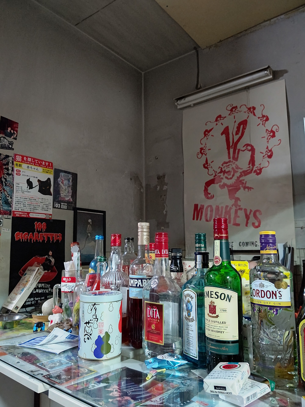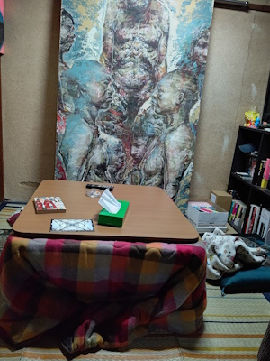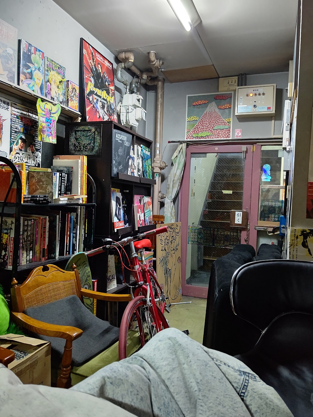 Review Do you watch Cartoonist Kayfabe? Well, think about some of the episodes where they've been looking at wierd, art-house manga, or interviewing some old comic creator who did esoteric underground stuff, who is also into obscure electronica and strange movies. Then imagine you could turn that episode into a bar! Well, that's Jan Kounen. It's in an old building and the back room of the bar has tatty old tatami mats and sliding closet doors. The bar area itself has salvaged old armchairs and sofas from god-knows-where, and nothing is on tap. The first time I went, they ran out of beer, just like Claris, but Claris looks like a bar, Jan Kounen is like somebody's front room hastily turned into a bar, so them running out of beer is more "cute" than annoying. Anyway in the front they have a bunch of comics you can read, some in Japanese, some in English, and I think I saw some in French. They even have British ones! Skewed towards "art house" ones, of course. They also apparently have regular tarot readings, it's that sorta place. |