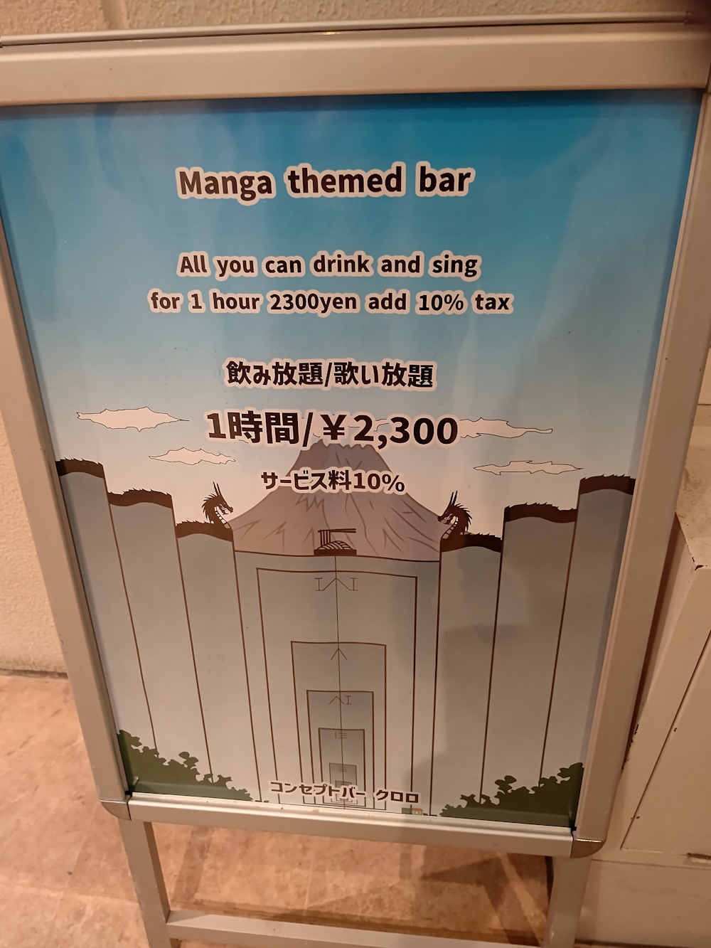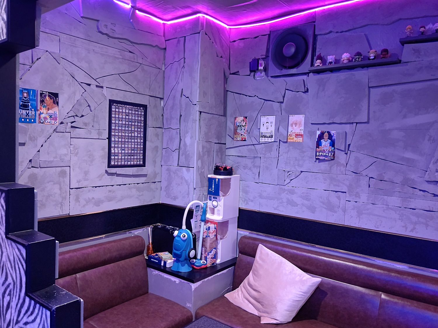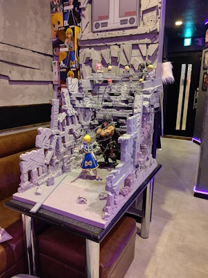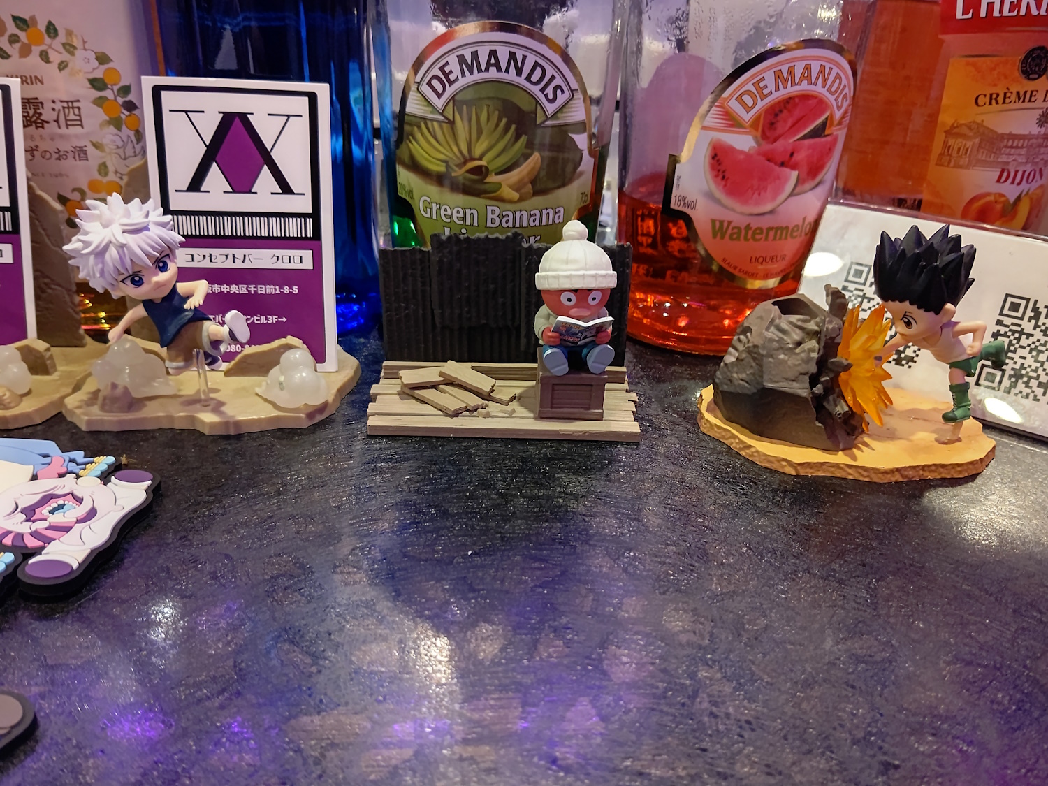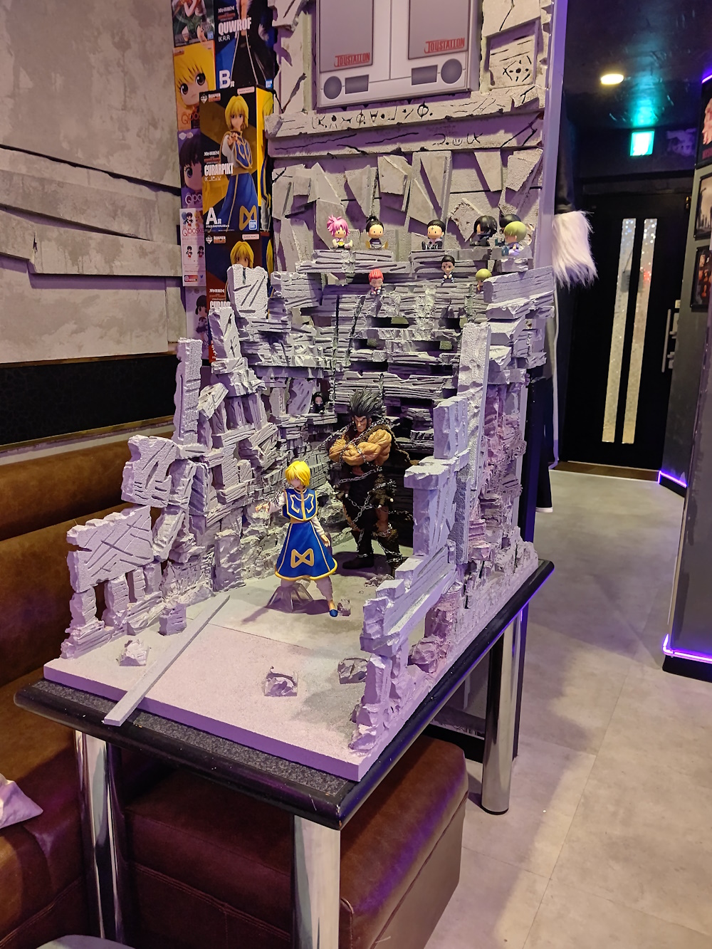 Review A bar I found, once again, by the time-honoured tradition of just walking about. Actually a week or two before I saw the sign for Laugh Tale in passing, while hanging out with some other people. I re-found that sign by pure luck later on, and discovered there's not one, but TWO otaku bars in the same building! Neither of which I knew anything about before. See, that's why you can't rely on just the internet. Anyway, this is more of a "Concafe", and an expensive one, at that. Well it seems so at first, being ¥2300 per hour, but that is also nomihodai, so the prices are actually pretty typical for this sort of thing. Still, there's cheaper options that aren't too far away, if you're otakuin' on a budget. When I went there, by pure luck, a new staff member who speaks English had just joined. That's actually happened to me twice now. She was there on a Saturday, but I don't know if that's her regular day or not. Pictures on Google Maps show the bar with various manga pages plastered around the walls, but they have now changed the decor to "broken rocks" looking wall coverings. There's also an interesting big display at the back of the room, and the usual other figures on the bar and shelves, but not in overwhelming numbers, as you get in some other places. |