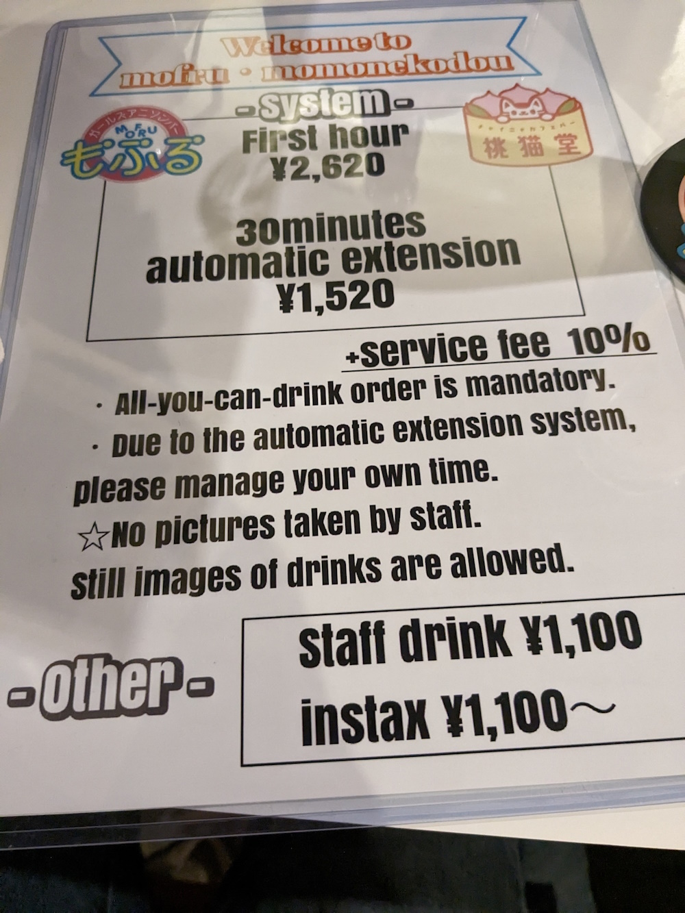 Details Just under ¥3000 per hour for the first hour, about ¥1700 for subsequent half-hours. Oddly, the prices aren't gender-segregated. All-you-can-drink in that time. If you want to buy a staff member a drink it's ¥1100 for whatever one. Also they'll take a picture of you with a staff member for ¥1100 using an instant camera. |