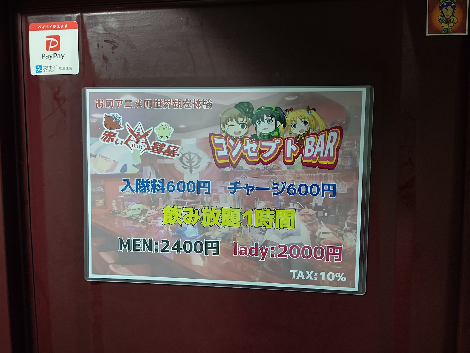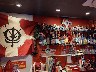Review Another bar I found because I did a Google Maps search when I was in the actual area, so it gave me more recommendations... I think. Anyway, as you may be able to tell, it's dedicated heavily to Zeon, the "baddies" of Gundam (I think). I don't actually remember too much, due to being very drunk when I got there, but the mama and other customers were very fun, and we had a nice time talking about (the very very little I know of) Gundam, Gunpla and other mecha and nerd stuff. They also crammed me into (half of) a cosplay and I tried to do my best bad-guy grimace and not laugh, it didn't work. |