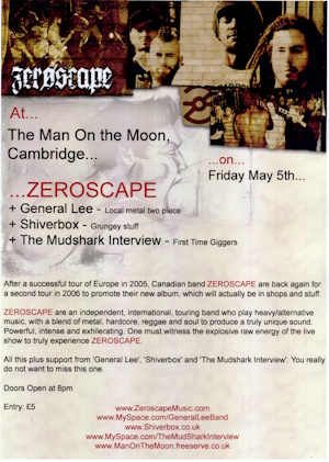 The bass player, Claudia, was also in a folk band called Working Title. They played Strawberry Fair and the Cambridge Beer Festival a few times. Zeroscape An awesome Canadian Reggae-Metal band who toured Europe in 2005 and 2006. On the first tour they bought this piece-of-shit van sight unseen off Ebay, of course it barely worked. They got some graffiti artists in Sweden or Denmark to do an awesome piece on it, but they kept getting pulled over so repainted it white with Dulux and rollers. Anyway my brother and I, along with some of his friends, ended up hanging out with the guys. We also saw them in London with about 10 emo bands opening who were all the same. When Zeroscape came on the whole audience was moshing. To be fair at that point "the whole audience" was 5 people. I was also absurdly pissed. We had to hang about outside King's Cross all night to wait for the first train. It was just after 7/7 so there was cops everywhere and we didn't get mugged, so that turned out alright. Anyway, in the knowledge that they were going to be back in 2006, I planned to have issue 1 of the original SCV, then more of a fanzine with comics, ready a month before they were due to play Man on the Moon (RIP) on May 5th 2006, and advertise the gig on the back cover. That fell flat, and morphed into the Zeroscape gig being SCV's "launch party" and, erm, in 2023 SCV is still going to come about somewhen or other. They also played in Bury St Edmonds, we were shoved in a tiny back room that didn't even have a proper stage, just a kind of roped-off corner. Still got an awesome pit going among the audience, which mostly consisted of members of the support. I beleive it was also in Bury in 2006 where they did manage to draw a real audience, in a tiny room. But the bar owner's friends wanted to play so they only did 3-4 songs. My brother filmed this on a Mini-DV camcorder, then taped over some of the best bits on the way home, filming the lights of passing cars. Which wasn't clever.
