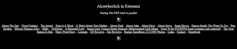 That time our car broke down and created a giant traffic jam. My granny said there had been a "6 mile tailback" on the news and I just randomly decided our Audi 80 had caused it. It might have done, I remember looking back out the window and seeing cars stopping up and down the hills behind us. No mobiles back then, so my dad had to walk back to a Little Chef and call the AA. We finally got it shoved out of the way and cars were passing for ages while I sat watching. I also vaguely remember stopping in some suburb for a mechanic to get under the engine compartment and have all the oily bits out. I'm surprised we even made it to the holiday. That bar that chucked out an old granny for wearing a hat, because she might be a chav My brother worked there, he quit about a month before it happened. It sounded like the bar was really badly run, with nepotistic "hires" who just slept in the back room while people the boss wasn't friends with worked twice as hard. Fish Aid My brother owned a guitar for 5 minutes and was suddenly in this band. Never mind if he'd learned to play it or not. Apparently they sent something to John Peel and he said he liked the name. No comment on the, er, music, I notice. Cruel to be Kind A two-piece band my brother was in with some nutter. They made a genre of music called "Pisscore", which basically consisted of pummeling a cheap drum machine and randomly twanging a guitar while screaming incoherent swear words and occasionally quoting the TV Go Home book. Song titles included Moody Bitch, A Bag of Smashed Twats, Diluted is a Cunt (the only one with actual lyrics, based on some bloke they were arguing with on a forum), Scrambled is a Cunt (also about somebody they were arguing with on a forum, later they became friends with him) and a bunch of others. They made three, er, "albums" over about 6 months in the middle of 2003. The second was tastefully titled The Second Shitdicking. The first two albums back-to-back fit comfortably on one side of a casette. There were also a few (well, two) copies on Minidiscs. I doubt any copies exist any more. The tape was probably left in my old car for years and then went to the scrapyard with it.